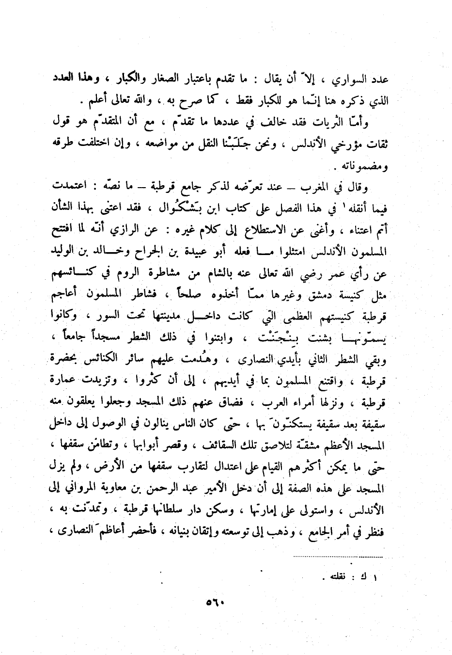 وقال في المغرب - عند تعرّضه لذكر جامع قرطبة - ما نصّه: اعتمدت فيما أنقله (1) في هذا الفصل على كتاب ابن بشكوال، فقد اعتنى بهذا الشأن أتم اعتناء، وأغنى عن الاستطلاع إلى كلام غيره: عن الرازي أنّه لما افتتح المسلمون الأندلس امتثلوا ما فعله أبو عبيدة بن الجراح وخالد بن الوليد عن رأي عمر رضي الله تعالى عنه بالشام من مشاطرة الروم في كنائسهم مثل كنيسة دمشق وغيرها ممّا أخذوه صلحاً، فشاطر المسلمون أعاجم قرطبة كنيستهم العظمى التي كانت داخل مدينتها تحت السور، وكانوا يسمّونها بشنت بنجنت، وابتنوا في ذلك الشطر مسجداً جامعاً، وبقي الشطر الثاني بأيدي النصارى، وهدمت عليهم سائر الكنائس بحضرة قرطبة، واقتنع المسلمون بما في أيديهم، إلى أن كثروا، وتزيدت عمارة قرطبة، ونزلها أمراء العرب، فضاق عنهم ذلك المسجد وجعلوا يعلقون منه سقيفة بعد سقيفة يستكنّون بها، حتى كان الناس ينالون في الوصول إلى داخل المسجد الأعظم مشقّة لتلاصق السقائف، وقصر أبوابها، وتطامن سقفها، حتى ما يمكن أكثرهم القيام على اعتدال لتقارب سقفها من الأرض، ولم يزل المسجد على هذه الصفة إلى أن دخل الأمير عبد الرحمن بن معاوية المرواني إلى الأندلس، واستولى على إمارتها، وسكن دار سلطانها قرطبة، وتمدّنت به، فنظر في أمر الجامع، وذهب إلى توسعته وإتقان بنيانه، فأحضر أعاظم النصارى،