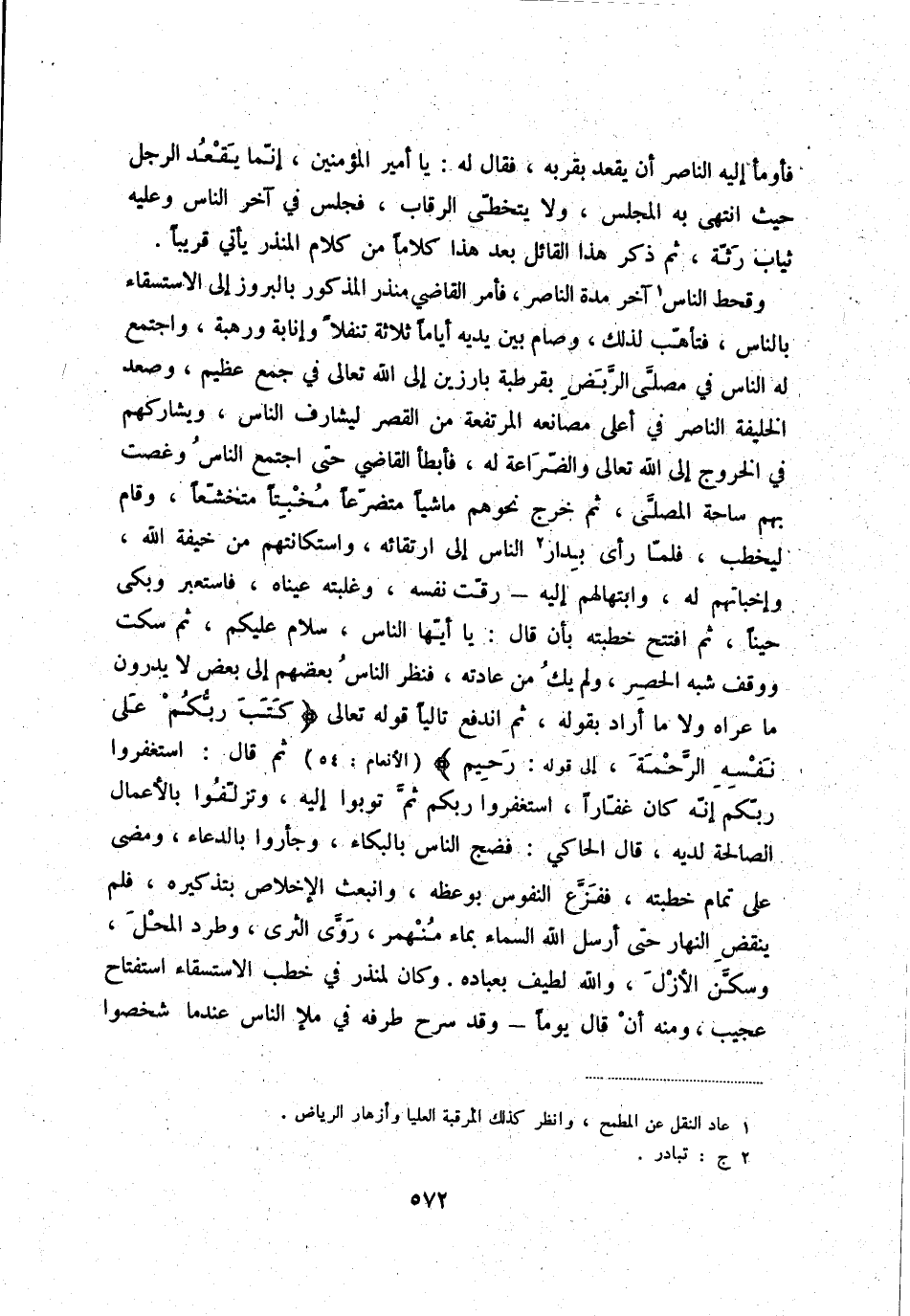 وقحط الناس (1) آخر مدة الناصر، فأمر القاضي منذر المذكور بالبروز إلى الاستسقاء بالناس، فتأهّب لذلك، وصام بين يديه أياماً ثلاثة تنفلاً وإنابة ورهبة، واجتمع له الناس في مصلّى الرّبض بقرطبة بارزين إلى الله تعالى في جمع عظيم، وصعد الخليفة الناصر في أعلى مصانعه المرتفعة من القصر ليشارف الناس، ويشاركهم في الخروج إلى الله تعالى والضّراعة له، فأبطأ القاضي حتى اجتمع الناس وغصت بهم ساحة المصلّى، ثم خرج نحوهم ماشياً متضرّعاً مخبتاً متخشّعاً، وقام ليخطب، فلمّا رأى بدار (2) الناس إلى ارتقائه، واستكانتهم من خيفة الله، وإخباتهم له، وابتهالهم إليه - رقّت نفسه، وغلبته عيناه، فاستعبر وبكى حيناً، ثم افتتح خطبته بأن قال: يا أيّها الناس، سلام عليكم، ثم سكت ووقف شبه الحصر، ولم يك من عادته، فنظر الناس بعضهم إلى بعض لا يدرون ما عراه ولا ما أراد بقوله، ثم اندفع تالياً قوله تعالى " كتب ربّكم على نفسه الرّحمة، إلى قوله: رحيم " ثم قال: استغفروا ربّكم إنّه كان غفّاراً، استغفروا ربكم ثمّ توبوا إليه، وتزلّفوا بالأعمال الصالحة لديه، قال الحاكي: فضج الناس بالبكاء، وجأروا بالدعاء، ومضى على تمام خطبته، ففزّع النفوس بوعظه، وانبعث الإخلاص بتذكيره، فلم ينقض النهار حتى أرسل الله السماء بماء منهمر، روّى الثرى، وطرد المحل وسكّن الأزل، والله لطيف بعباده. وكان لمنذر في خطب الاستسقاء استفتاح عجيب، ومنه أن قال يوماً - وقد سرح طرفه في ملإ الناس عندما شخصوا
