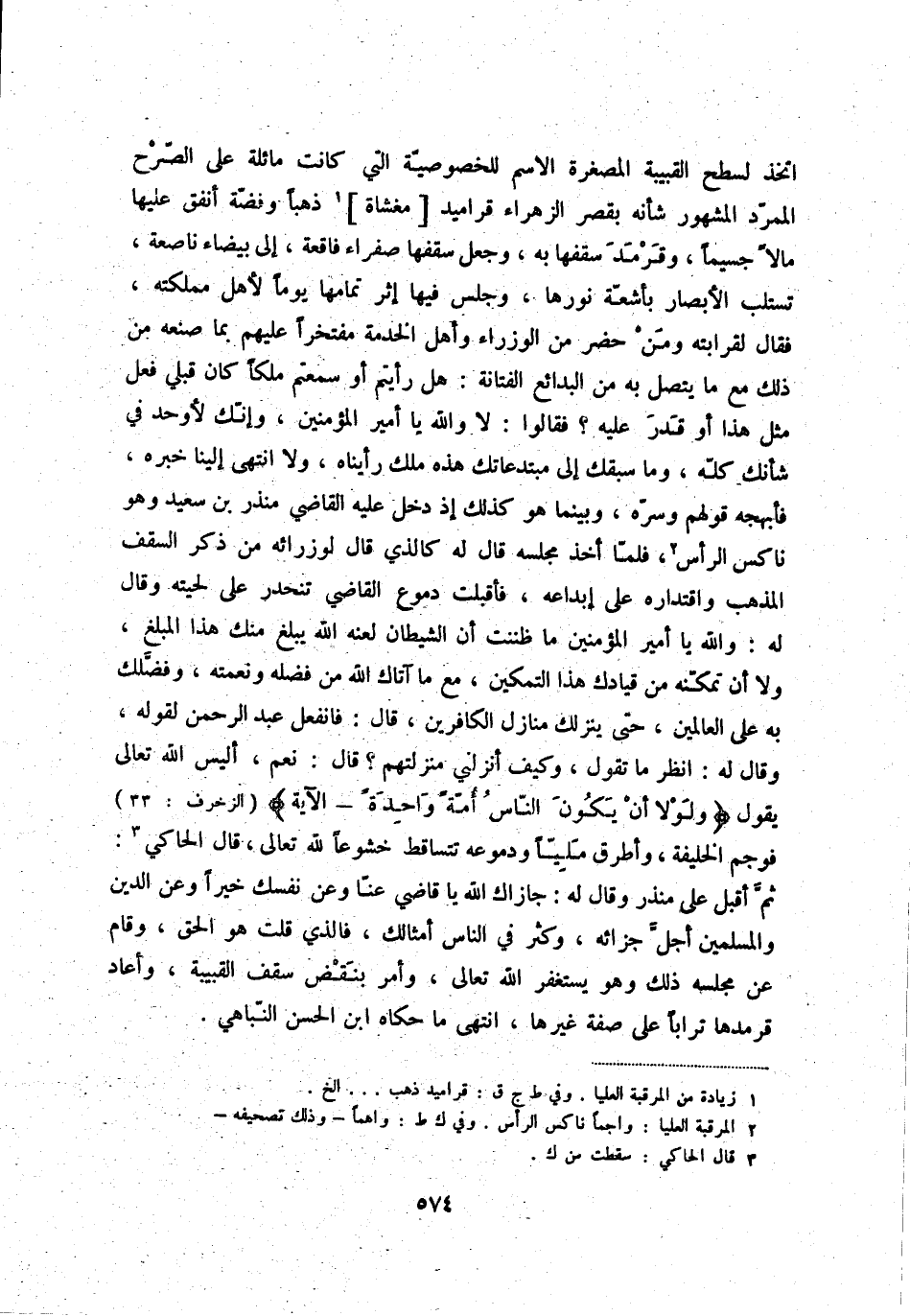 اتخذ لسطح القبيبة المصغرة الاسم للخصوصيّة التي كانت مائلة على الصّرح الممرّد المشهور شأنه بقصر الزهراء قراميد [مغشاة] (1) ذهباً وفضّة أنفق عليها مالاً جسيماً، وقرمد سقفها به، وجعل سقفها صفراء فاقعة، إلى بيضاء ناصعة، تستلب الأبصار بأشعّة نورها، وجلس فيها إثر تمامها يوماً لأهل مملكته، فقال لقرابته ومن حضر من الوزراء وأهل الخدمة مفتخراً عليهم بما صنعه من ذلك مع ما يتصل به من البدائع الفتانة: هل رأيتم أن سمعتم ملكاً كان قبلي فعل مثل هذا أو قدر عليه؟ فقالوا: لا والله يا أمير المؤمنين، وإنّك لأوحد في شأنك كلّه، وما سبقك إلى مبتدعاتك هذه ملك رأيناه، ولا انتهى إلينا خبره، فأبهجه قولهم وسرّه، وبينما هو كذلك إذ دخل عليه القاضي منذر بن سعيد وهو ناكس الرأس (2) ، فلمّا أخذ مجلسه قال له كالذي قال لوزرائه من ذكر السقف المذهب واقتداره على إبداعه، فأقبلت دموع القاضي تنحدر على لحيته وقال له: يا أمير المؤمنين ما ظننت الشيطان لعنه الله يبلغ منك هذا المبلغ، ولا أن تمكّنه من قيادك هذا التمكين، مع ما آتاك الله من فضله ونعمته، وفضّلك به على العالمين، حتى ينزلك منازل الكافرين، قال: فانفعل عبد الرحمن لقوله، وقال له: انظر ما تقول، وكيف أنزلني منزلتهم؟ قال: نعم، أليس الله تعالى يقول " ولولا أن يكون النّاس أمّةً واحدةً - الآية " فوجم الخليفة، وأطرق مليّاً ودموعه تتساقط خشوعاً لله تعالى، قال الحاكي (3) : ثمّ أقبل على منذر وقال له: جازاك الله يا قاضي عنّا وعن نفسك خيراً وعن الدين والمسلمين أجلّ جزائه، وكثر في الناس أمثالك، فالذي قلت هو الحق، وقام عن مجلسه ذلك وهو يستغفر الله تعالى، وأمر بنقض سقف القبيبة، وأعاد قرمدها تراباً على صفة غيرها، انتهى ما حكاه ابن الحسن النّباهي.