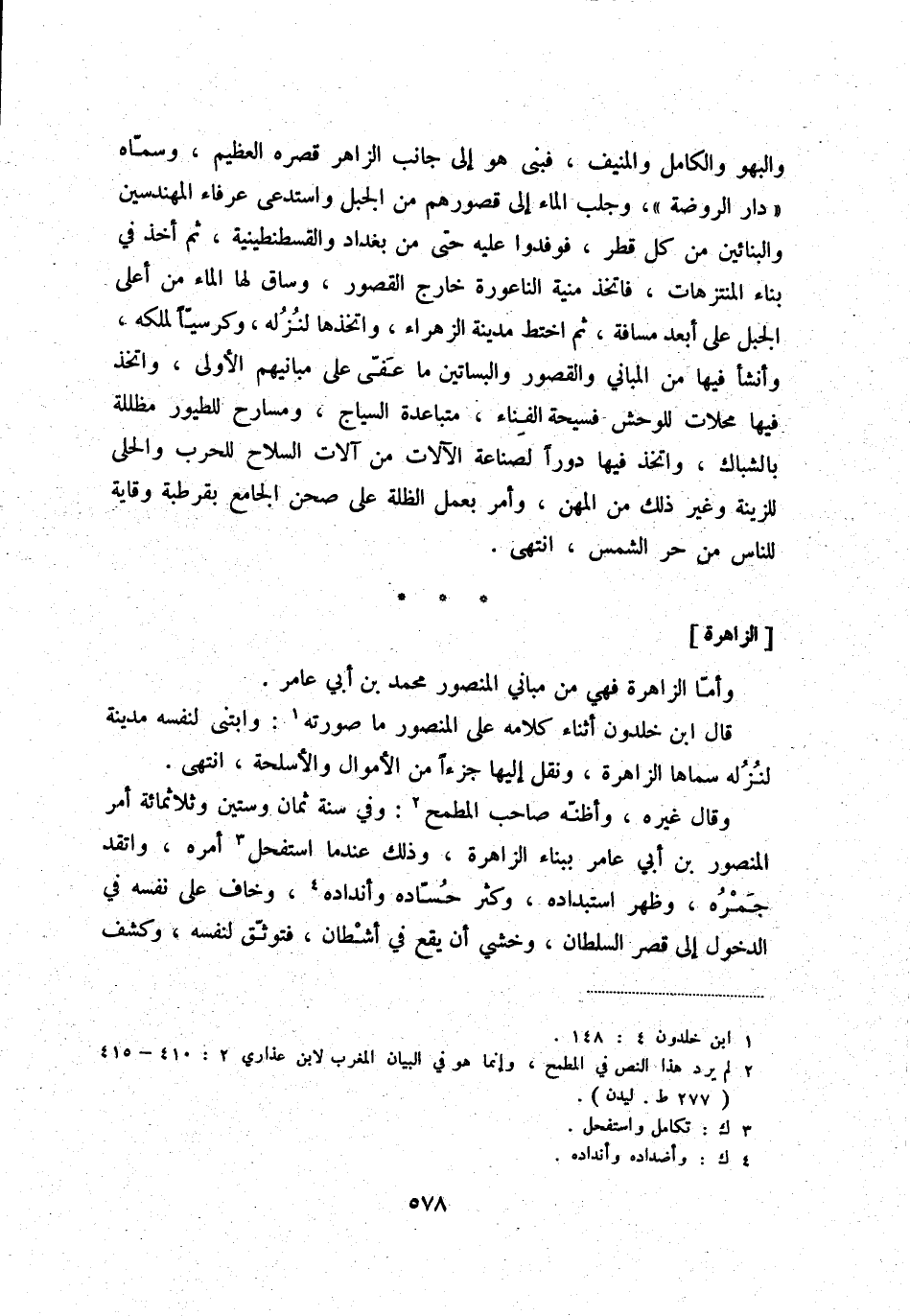 قال ابن خلدون أثناء كلامه على المنصور ما صورته (1) : وابتنى لنفسه مدينة لنزله سماها الزاهرة، ونقل إليها جزءاً من الأموال والأسلحة، انتهى.