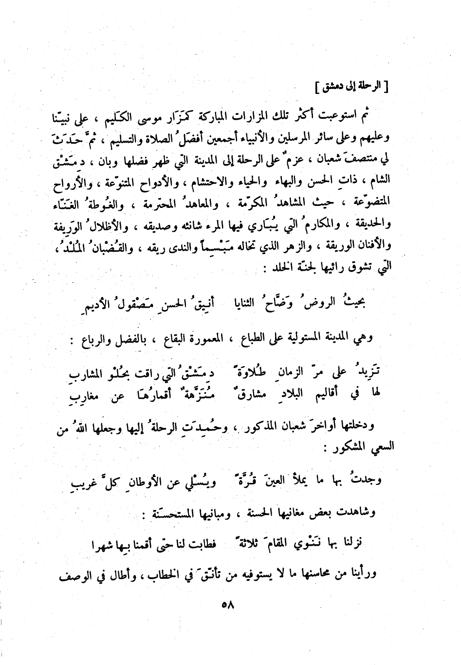 ثم استوعبت أكثر تلك المزارات المباركة كمزار موسى الكليم، على نبينا وعليهم وعلى سائر المرسلين والأنبياء أفضل الصلاة والتسليم، ثم حدث لي منتصف شعبان، عزم على الرحلة إلى المدينة التي ظهر وبان، دمشق الشام، ذات الحسن والبهاء والحياء والاحتشام، والأدواح المتنوعة، والأرواح المتضوعة، حيث المشاهد المكرمة، والمعاهد المحترمة، والغوطة الغناء والحديقة، والمكارم التي يباري فيها المرء شانئه وصديقه، والأظلال الوريفة والأفنان الوريقة، والزهر الذي تخاله مبسماً والندى ريقه، والقضبان الملد، التي تشوق رائيها لجنة الخلد: