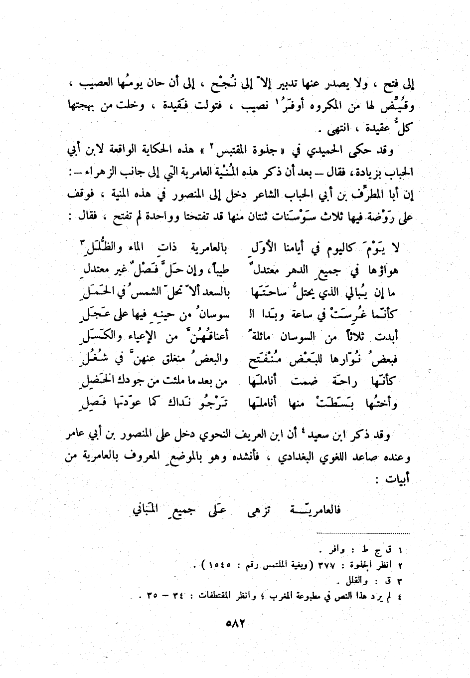 وقد حكى الحميدي في " جذوة المقتبس " (2) هذه الحكاية الواقعة لابن أبي الحباب بزيادة، فقال - بعد أن ذكر هذه المنية العامرية التي إلى جانب الزهراء -: إن أبا المطرّف بن أبي الحباب الشاعر دخل إلى المنصور في هذه المنية، فوقف على روضة فيها ثلاث سوسنات ثنتان منها قد تفتحتا وواحدة لم تفتح، فقال: