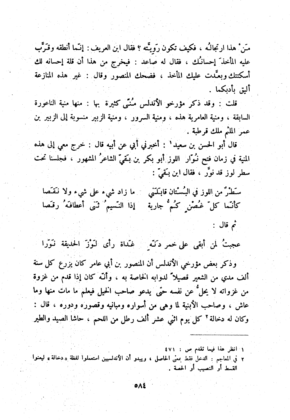 عجبت لمن أبقى على خمر دنّه ... غداة رأى لوز الحدية نوّرا وذكر بعض مؤرخي الأندلس أن المنصور بن أبي عامر كان يزرع كل سنة ألف مدي من الشعير قصيلاً لدوابه الخاصة به، وأنّه كان إذا قدم من غزوة من غزواته لا يحلّ عن نفسه حتى يدعو صاحب الخيل فيعلم ما مات منها وما عاش، وصاحب الأبنية لما وهى من أسواره ومبانيه وقصوره ودوره، قال: وكان له دخالة (2) كل يوم اثني عشر ألف رطل من اللحم، حاشا الصيد والطير