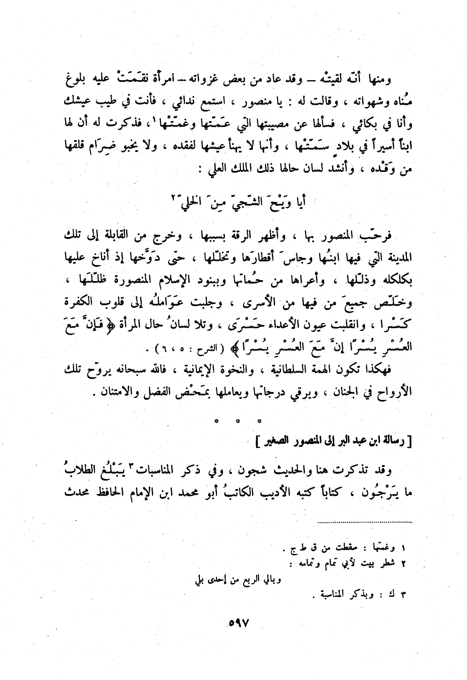 أيا ويح الشجيّ من الخليّ (2) ... فرحّب المنصور بها وأظهر الرقة بسببها، وخرج من القابلة إلى تلك المدينة التي فيها ابنها وجاس أقطارها وتخلّلها، حتى دوّخها إذ أناخ عليها بكلكله وذلّلها، وأعراها من حماتها وببنود الإسلام المنصورة ظلّلها، وخلّص جميع من فيها من الأسرى، وجلبت عوامله إلى قلوب الكفرة كسرا، وانقلبت عيون الأعداء حسرى، وتلا لسان حال المرأة " فإنّ مع العسر يسراً إنّ مع العسر يسراً ".