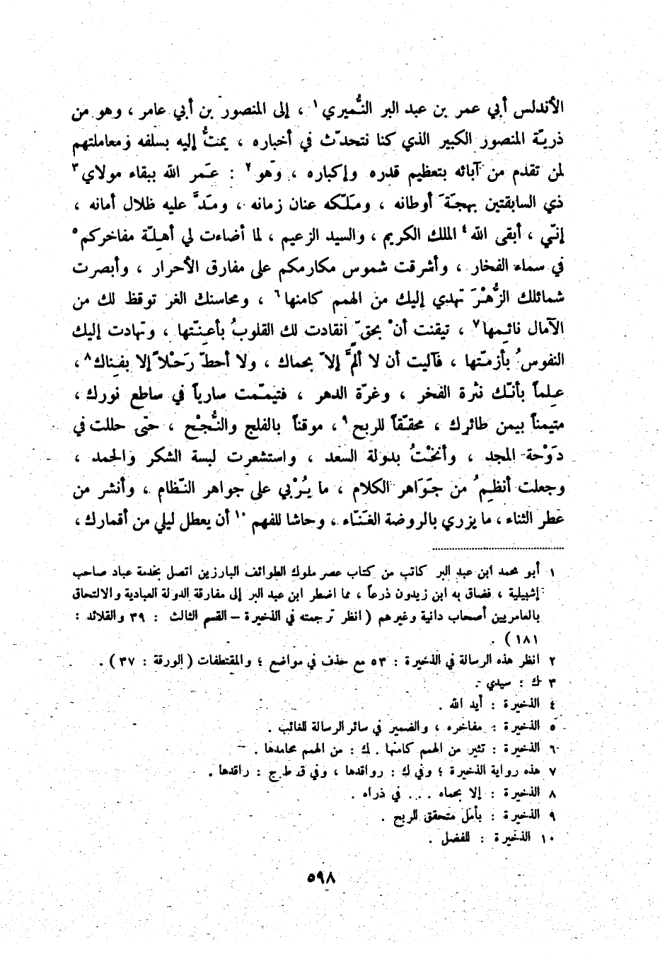 الأندلس أبي عمر بن عبد البر النّميري (1) ، إلى المنصور بن أبي عامر، وهو من ذريّة المنصور الكبير الذي كنا نتحدّ في أخباره، يمتّ إليه بسلفه ومعاملتهم لمن تقدم من آبائه بتعظيم قدره وإكباره، وهو (2) : عمر الله ببقاء مولاي (3) ذي السابقتين بهجة أوطانه، وملّكه عنان زمانه، ومدّ عليه ظلال أمانه، إنّي، أبقى الله (4) الملك الكريم، والسيد الزعيم، لما أضاءت لي أهلّة مفاخركم (5) في سماء الفخار، وأشرقت شموس مكارمكم على مفارق الأحرار، وأبصرت شمائلك الزّهر تهدي إليك من الهمم كامنها (6) ، ومحاسن كالغر توقظ لك من الآمال نائمها (7) ، تيقنت أن بحقّ انقادت لك القلوب بأعنّتها، وتهادت إليك النفوس بأزمّتها، فآليت أن لا ألمّ إلاّ بحماك، ولا أحطّ رحلاً إلا بفناك (8) ، علماً بأنّك نثرة الفخر، وغرّة الدهر، فتيمّمت سارياً في ساطع نورك، متيمناً بيمن طائرك، محقّقاً للربح (9) ، موقناً بالفلج والنّجح، حتى حللت في دوحة المجد، وأنخت بدولة السعد، واستشعرت لبسة الشكر والحمد، وجعلت أنظم من جواهر الكلام، ما يربي على جواهر النّظام، وأنشر من عطر الثناء، ما يزري بالروضة الغنّاء، وحاشا للفهم (10) أن يعطل ليلي من أقمارك،