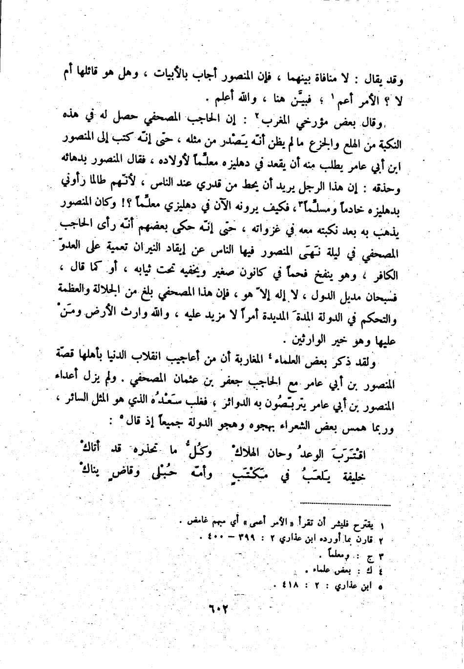 ولقد ذكر بعض العلماء (4) المغاربة أن من أعاجيب انقلاب الدنيا بأهلها قصّة المنصور بن أبي عامر مع الحاجب جعفر بن عثمان المصحفي. ولم يزل أعداء المنصور بن أبي عامر يتربّصون به الدوائر، فغلب سعده الذي هو المثل السائر، وربما همس بعض الشعراء بهجوه وهجو الدولة جميعاً إذ قال (5) :