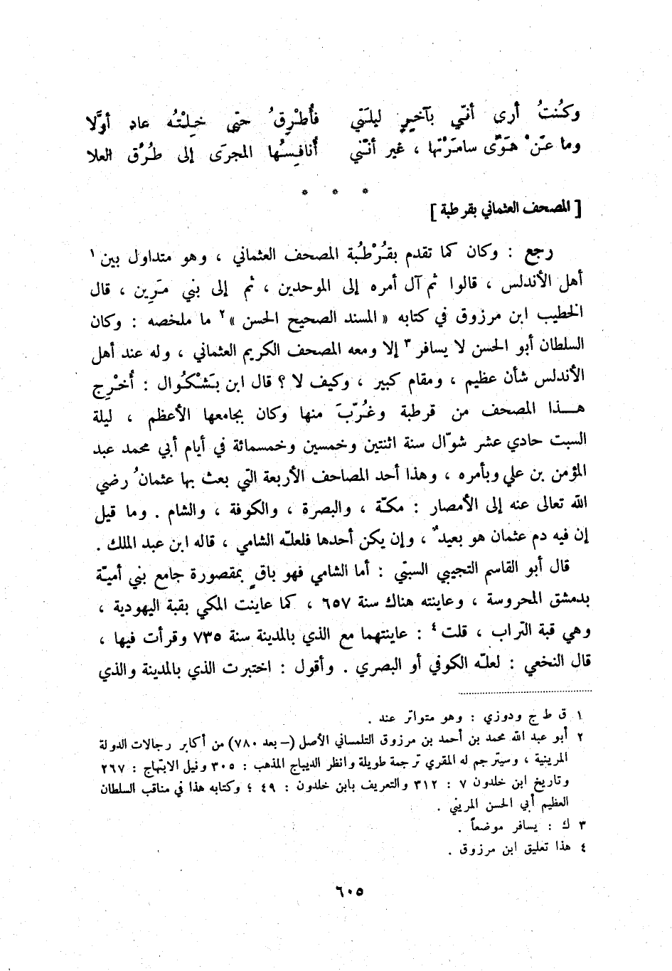 رجع: وكان كما تقدم بقرطبة المصحف العثماني، وهو متداول بين (1) أهل الأندلس، قالوا ثم آل أمره إلى الموحدين، ثم إلى بني مرين، قال الخطيب ابن مروزق في كتابه " المسند الصحيح الحسن " (2) ما ملخصه: وكان السلطان أبو الحسن لا يسافر (3) إلا ومعه المصحف الكريم العثماني، وله عند أهل الأندلس شأن عظيم، ومقام كبير، وكيف لا؟ قال ابن بشكوال: أخرج هذا المصحف من قرطبة وغرّب منها وكان بجامعها الأعظم، ليلة السبت حادي عشر شوّال سنة اثنتين وخمسين وخمسمائة في أيام أبي محمد عبد المؤمن بن علي وبأمره، وهذا أحد المصاحف الأربعة التي بعث بها عثمان رضي الله تعالى عنه إلى الأمصار: مكّة، والبصرة، والكوفة، والشام. وما قيل إن فيه دم عثمان هو بعيدٌ، وإن يكن أحدها فلعلّه الشامي، قاله ابن عبد الملك.