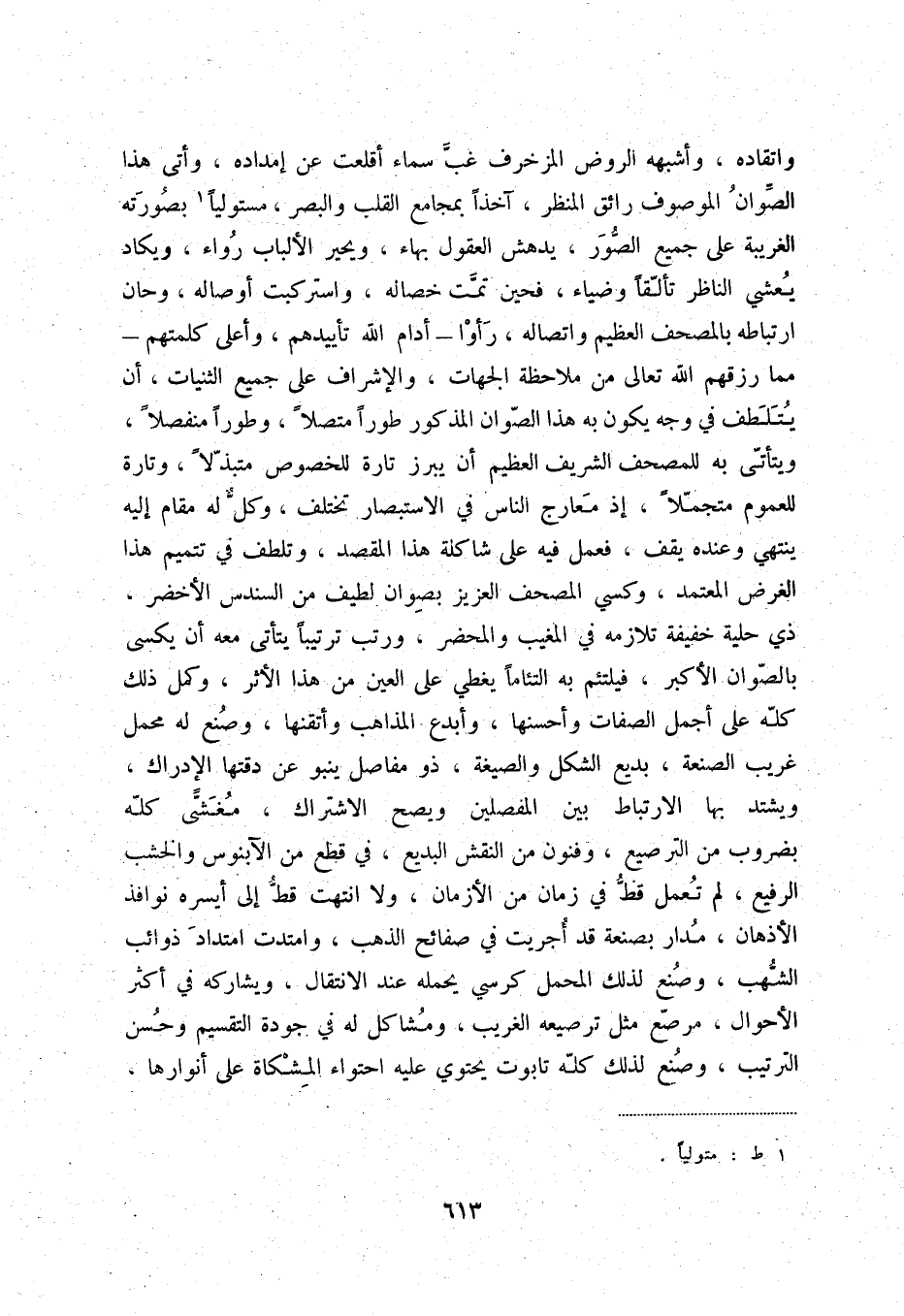 واتقاده، وأشبهه الروض المزخرف غبّ سماء أقلعت عن إمداده، وأتى هذا الصّوان الموصوف رائق المنظر، آخذاً بمجامع القلب والبصر، مستولياً (1) بصورته الغريبة على جميع الصّور، يدهش العقول بهاء، ويحير الألباب رواء، ويكاد يعشي الناظر تألّقاً وضياء، فحين تمّت خصاله، واستركبت أوصاله، وحان ارتباطه بالمصحف العظيم واتصاله، رأوا - أدام الله تأييدهم، وأعلى كلمتهم - مما رزقهم الله تعالى من ملاحظة الجهات، والإشراف على جميع الثنيات، أن يتلطف فيوجه يكون به هذا الصّوان المذكور طوراً متصلاً، وطوراً منفصلاً، ويتأتّى به للمصحف الشريف العظيم أن يبرز تارة للخصوص متبذّلاً، وتارة للعموم متجمّلاً، إذ معارج الناس في الاستبصار تختلف، وكلّ له مقام إليه ينتهي وعنده يقف، فعمل فيه على شاكلة هذا المقصد، وتلطف في تتميم هذا الغرض المعتمد، وكسي المصحف العزيز بصوان لطيف من السندس الأخضر، ذي حلية خفيفة تلازمه في المغيب والمحضر، ورتب ترتيباً يتأتى معه أن يكسى بالصّوان الأكبر، فيلتئم به التئاماً يغطي على العين من هذا الأثر، وكمل ذلك كلّه على أجمل الصفات وأحسنها، وأبدع المذاهب وأتقنها، وصنع له محمل غريب الصنعة، بديع الشكل والصيغة، ذو مفاصل ينبو عن دقتها الإدراك، ويشتد بها الارتباط بين المفصلين ويصح الاشتراك، مغشىًّ كلّه بضروب من الترصيع، وفنون من النقش البديع، في قطع من الآبنوس والخشب