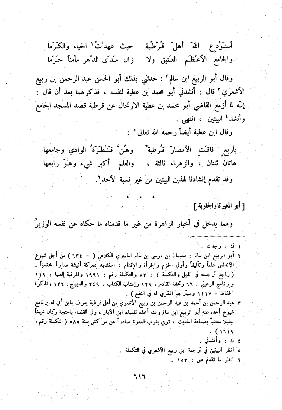 (2) أبو الربيع ابن سالم: سليمان بن موسى بن سالم الحميري الكلاعي (- 634) من أجل شيوخ الأندلس علماً وتأليفاً وأولي الحزم والجرأة وافقدام، استشهد بمعركة أنيشة صابراً محتسباً. (راجع ترجمته في الذيل والتكملة 4: 83 والتكملة رقم: 1991 والمرقبة إلعليا: 119 وبرنامج الرعيني: 66 وتحفة القادم: 129 وإعتاب الكتاب: 249 والديباج: 122 وتذكرة الحفاظ: 1417 وسيترجم المقري له في النفح) .