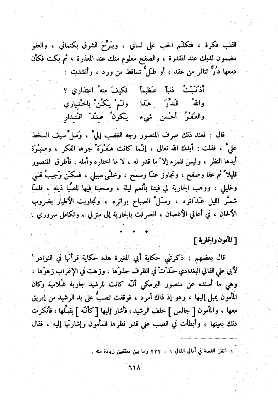 والعفو أحسن شيء ... يكون عند اقتدار قال: فعند ذلك صرف المنصور وجه الغضب إليّ، وسلّ سيف السخط عليّ، فقلت: أيدك الله تعالى، إنّما كانت هفوةً جرها الفكر، وصبوة أيدها النظر، وليس للمرء إلاّ ما قدر له، لا ما اختاره وأمله. فأطرق المنصور قليلاً ثم عفا وصفح، وتجاوز عنّا وسمح، وخلّى سبيلي، فسكن وجيب قلبي وغليلي، ووهب الجارية لي فبتنا بأنعم ليلة وسجنها فيها للصباذيلة، فلما شمر الليل غدائره، وسل الصباح بواتره، وتجاوبت الأطيار بضروب الألحان، في أعالي الأغصان، انصرفت بالجارية إلى منزلي، وتكامل سروري.