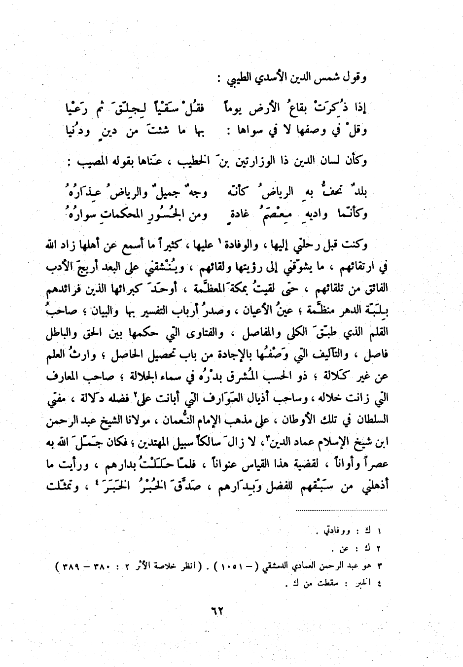 وكنت قبل رحلتي إليها، والوفادة عليها، كثيراً ما أسمع عن أهلها زاد الله في ارتقائهم، ما يشوقني إلى رؤيتها ولقائهم، وينشقني على البعد أريج الأدب الفائق من تلقائهم، حتى لقيت بمكة المعظمة، أوحد كبرائها الذين فرائدهم بلبة الدهر منظمة؛ عين الأعيان، وصدر أرباب التفسير بها والبيان؛ صاحب القلم الذي طبق الكلى والمفاصل، والفتاوي التي حكمها بين الحق والباطل فاصل، والتآليف التي وصفها بالإجادة من باب تحصيل الحاصل؛ وارث العلم عن غير كلالة؛ ذو الحسب المشرق بدره في سماء الجلالة؛ صاحب المعارف التي زانت خلاله، وساحب أذيال العوارف التي أبانت على فضله دلالة، مفتي السلطان في تلكم الأوطان، على مذهب الإمام النعمان، مولانا الشيخ عبد الرحمن ابن شيخ افسلام عماد الدين، لا زال سالكاً سبيل المهتدين؛ فكان جمل الله عصراً وأواناً، لقضية هذا القياس عنواناً، فلما حللت بدارهم، ورايت ما أذهلني من سبقهم للفضل وبدارهم، صدق الخبر الخبر، وتمثلت