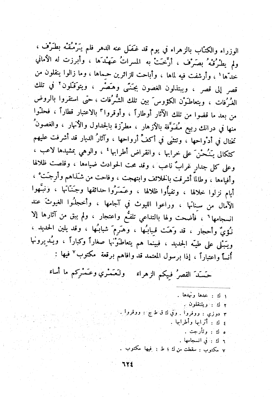 الوزراء والكتّاب بالزهراء في يوم قد غفل عنه الدهر فلم يرمقه بطرف، ولم يطرقه بصرف، أرّخت به المسرات عهدها، وأبرزت له الأماني خدّها (1) ، وأرشفت فيه لماها، وأباحت للزائرين حماها، وما زالوا ينقلون من قصر إلى قصر، ويبتذلون الغصون بجنىً وهصر، ويتوقّلون (2) في تلك الغرفات، يتعاطون الكؤوس بين تلك الشّرفات، حتى استقروا بالروض من بعد ما قضوا من تلك الآثار أوطاراً، وأوقروا (3) بالاعتبار قطاراً، فحلّوا منها في درانك ربيع مفوّفة بالأزهار، مطرّزة بالجداول والأنهار، والغصون تختال في أدواحها، وتتثنى في أكفّ أرواحها، وآثار الديار قد أشرفت عليهم كثكالى ينحن على خرابها، وانقراض أطرابها (4) ، والوهي بمشيدها لاعب، وعلى كل جدارٍ غرابٌ ناعب، وقد محت الحوادث ضياءها، وقلصت ظلالها وأفياءها، وطالما أشرقت بالخلائف وابتهجت، وفاحت من شذاهم وأرجت (5) ، أيام نزلوا خلالها وتفيأوا ظلالها، وعمروا حدائقها وجنّاتها، ونبّهوا الآمال من سناتها، وراعوا الليوث في آجامها، وأخجلوا الغيوث عند انسجامها (6) ، فأضحت ولها بالتداعي تلفّع واعتجار، ولم يبق من آثارها إلا نؤيٌ وأحجار، قد وهت قبابها، وهرم شبابها، وقد يلين الحديد، ويبلى على طيّه الجديد، فبينما هم يتعاطونها صغاراً وكباراً، ويديرونها أنساً واعتباراً، إذا برسول المعتمد قد وافاهم برقعة مكتوب (7) فيها: