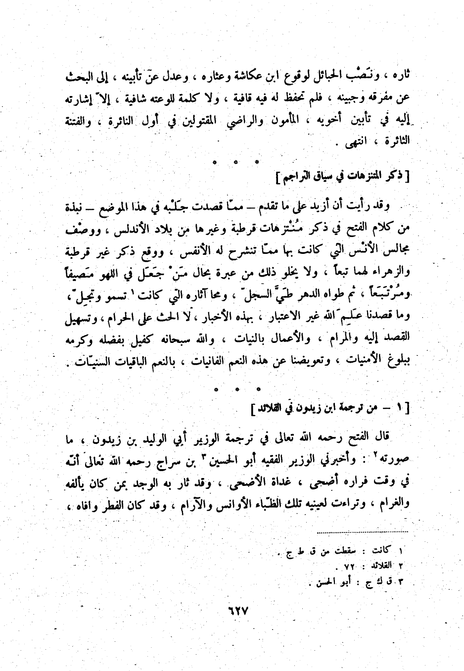 قال الفتح رحمه الله تعالى في ترجمة الوزير أبي الوليد بن زيدون، ما صورته (2) : وأخبرني الوزير الفقيه أبو الحسين (3) بن سراج رحمه الله تعالى أنّه في وقت فراره أضحى، غداة الأضحى، وقد ثار به الوجد بمن كان يألفه والغرام، وتراءت لعينيه تلك الظّباء الأوانس والآرام، وقد كان الفطر وافاه،