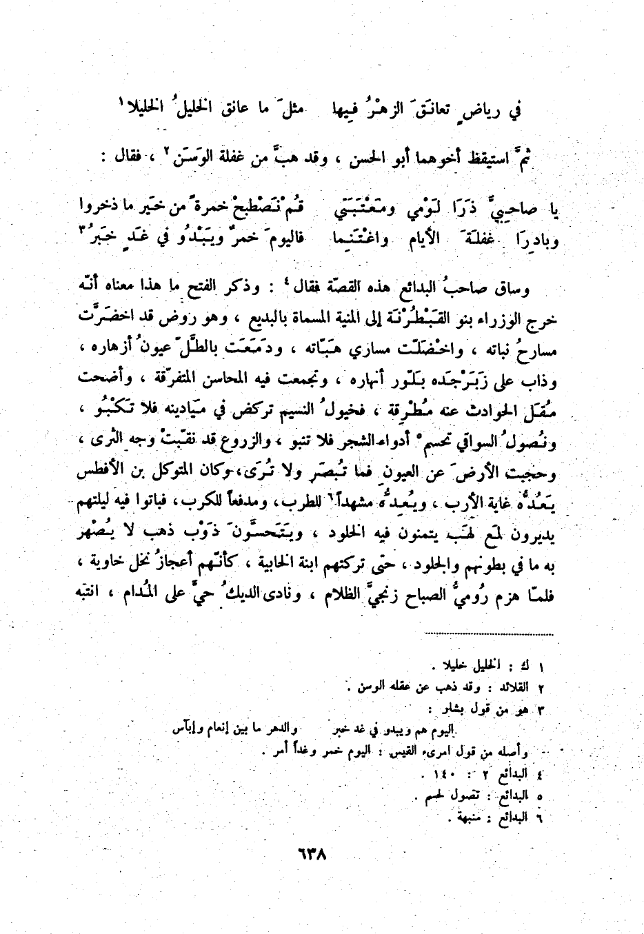 وبادرا غفلة الأيام واغتنما ... فاليوم خمرٌ ويبدو في غدٍ خبر (3) وساق صاحب البدائع هذه القصّة فقال (4) : وذكر الفتح ما هذا معناه أنّه خرج الوزراء بنو القبطرنة إلى المنية المسماة بالبديع، وهو روض قد اخضرّت مسارح نباته، واخضلّت مساري هبّاته، ودمعت بالطّلّ عيون أزهاره، وذاب على ربرجده بلّور أنهاره، وتجمعت فيه المحاسن المتفرّقة، وأضحت مقل الحوادث عنه مطرقة، فخيول النسيم تركض في ميادينه فلا تكبو، ونصول السواقي تحسم (5) أدواء الشجر فلا تنبو، والزروع قد نقّبت وجه الثرى، وحجبت الأرض عن العيون فما تبصر ولا ترى، وكان المتوكل بن الأفطس يعدّه غاية الأرب، ويعدّه مشهداً (6) للطرب، ومدفعاً للكرب، فباتوا فيه ليلتهم يديرون لمع لهب يتمنون فيه الخلود، ويتحسّون ذوب ذهب لا يصهر به ما في بطونهم والجلود، حتى تركتهم ابنة الخابية، كأنّهم أعجاز نخل خاوية، فلمّا هزم روميّ الصباح زنجيّ الظلام، ونادى الديك حيّ على المدام، انتبه