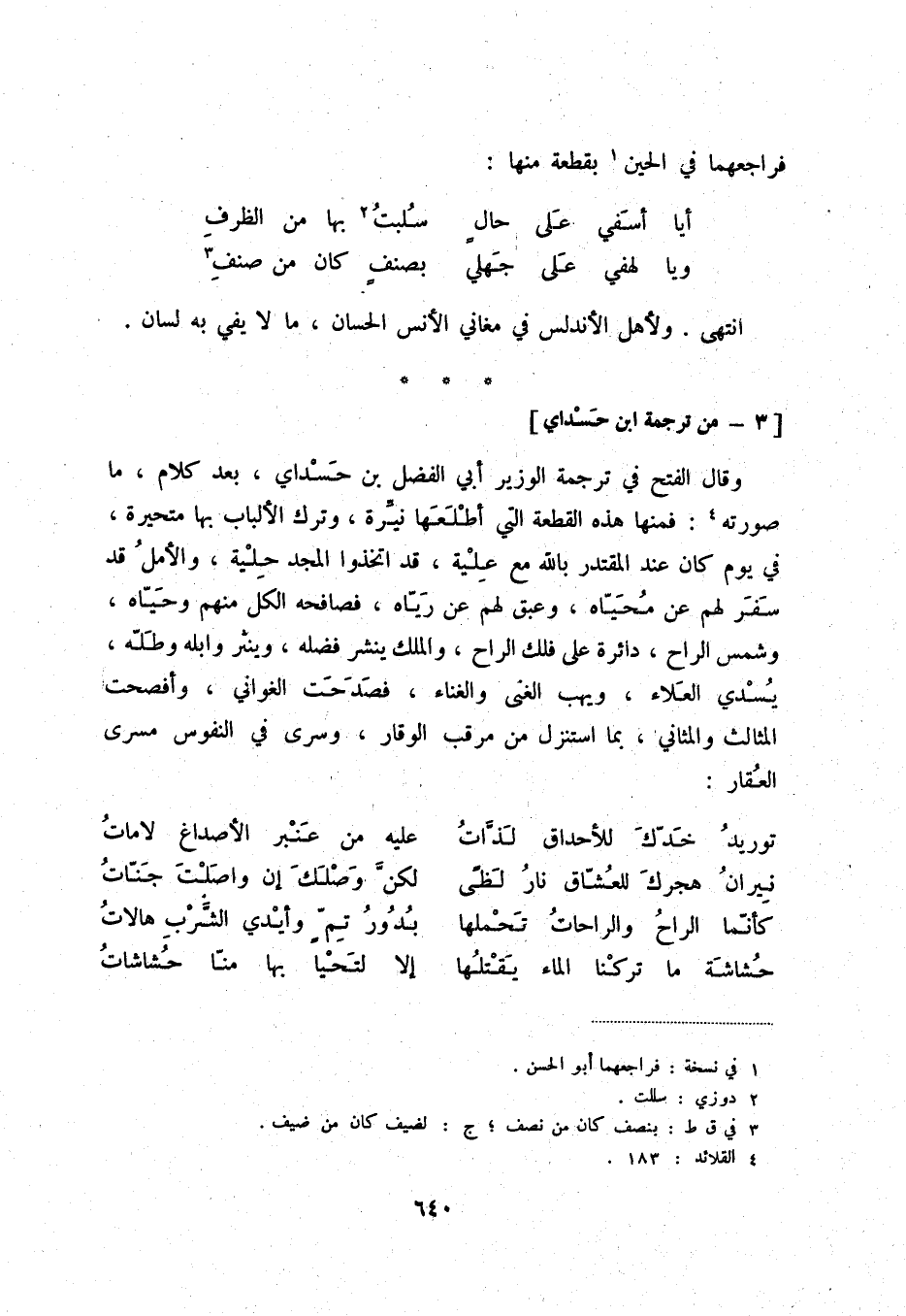 وقال الفتح في ترجمة الوزير أبي الفضل بن حسداي، بعد كلام، ما صورته (4) : فمنها هذه القطعة التي أطلعها نيّرة، وترك الألباب بها متحيرة، في يوم كان عند المقتدر بالله مع علية، قد اتخذوا المجد حلية، والأمل قد سفر لهم عن محيّاه، وعبق لهم عن ريّاه، فصافحه الكل منهم وحيّاه، وشمس الراح، دائرة على فلك الراح، والملك يشر فضله، وينثر وابله وطلّه، يسدي العلاء، ويهب الغنى والغناء، فصدحت الغواني، وأفصحت المثالث والمثاني، بما استنزل من مرقب الوقار، وسرى في النفوس مسرى العقار: