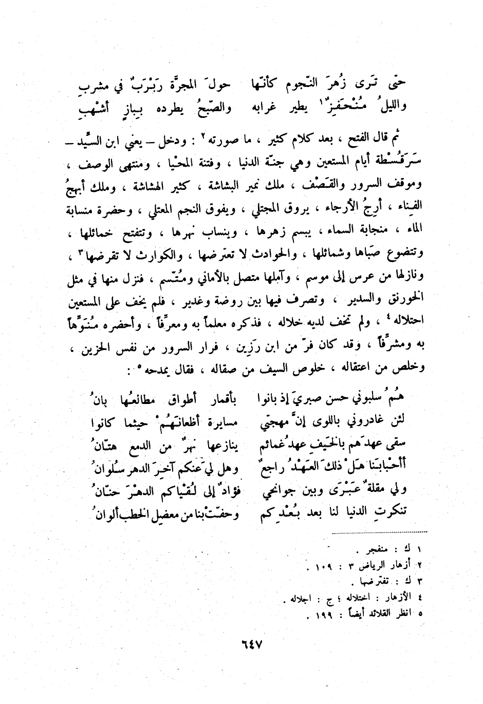 والليل منحفزٌ (1) يطير غرابه ... والصّبح يطرده ببازٍ أشهب ثم قال الفتح، بعد كلام كثير، ما صورته (2) : ودخل - يعني ابن السّيد - سرقسطة أيام المستعين وهي جنّة الدنيا، وفتنة المحيا، ومنتهى الوصف، وموقف السرور والقصف، ملك نمير البشاشة، كثير الهشاشة، وملك أبهج الفناء، أرج الأرجاء، يروف المجتلي، ويفوق النجم المعتلي، وحضرة منسابة الماء، منجابة السماء، يبسم زهرها، وينساب نهرها، وتتفتح خمائلها، وتتضوع صباها وشمائلها، والحوادث لا تعترضها، والكوارث لا تقرضها (3) ، ونازلها من عرس إلى موسم، وآملها متصل بالأماني ومتّسم، فنزل منها في مثل الخورنق والسدير، وتصرف فيها بين روضة وغدير، فلم يخف على المستعين احتلاله (4) ، ولم تخف لديه خلاله، فذكره معلماً به ومعرّفاً، وأحضره منوّهاً به ومشرّفاً، وقد كان فرّ من ابن رزين، فرار السرور من نفس الحزين، وخلص من اعتقاله، خلوص السيف من صقاله، فقال يمدحه (5) :