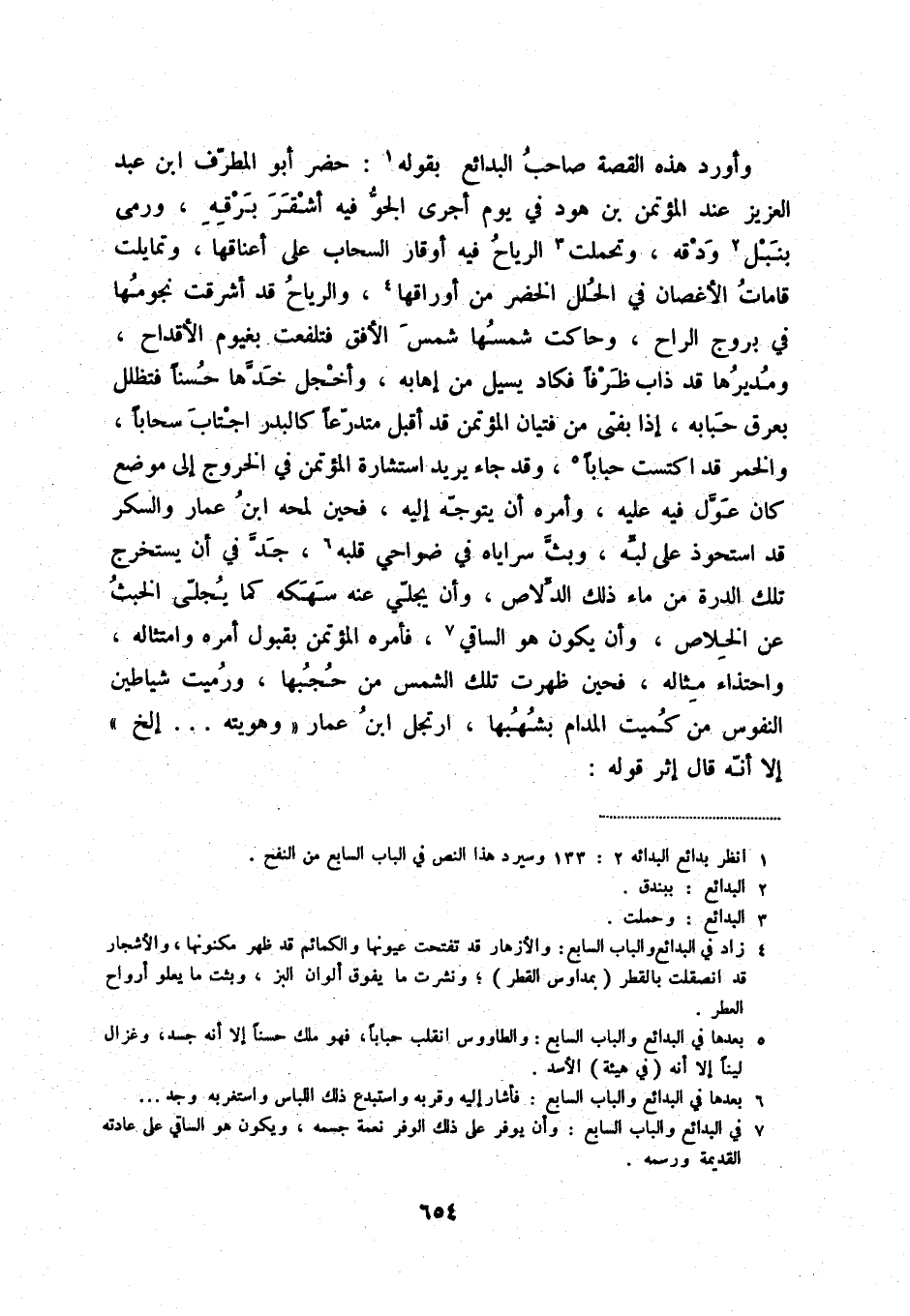 (4) زاد في البدائع والباب السابع: والأزهار قد تفتحت عيونها والكمائم قد ظهر مكنونها، والأشجار قد انقلت بالقطر (بمداوس القطر) ؛ ونثرت ما يفوق ألوان البز، وبثت ما يعلو أرواح العطر.