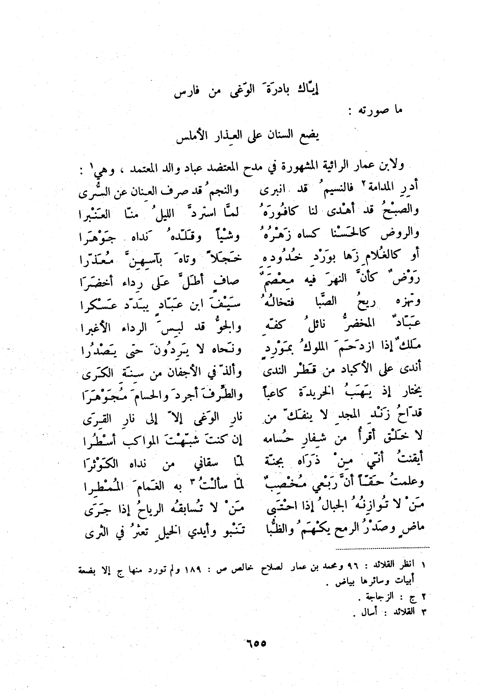 يضع السنان على العذار الأملس ... ولابن عمار الرائية المشهورة في مدح المعتضد عباد والد المعتمد، وهي (1) :