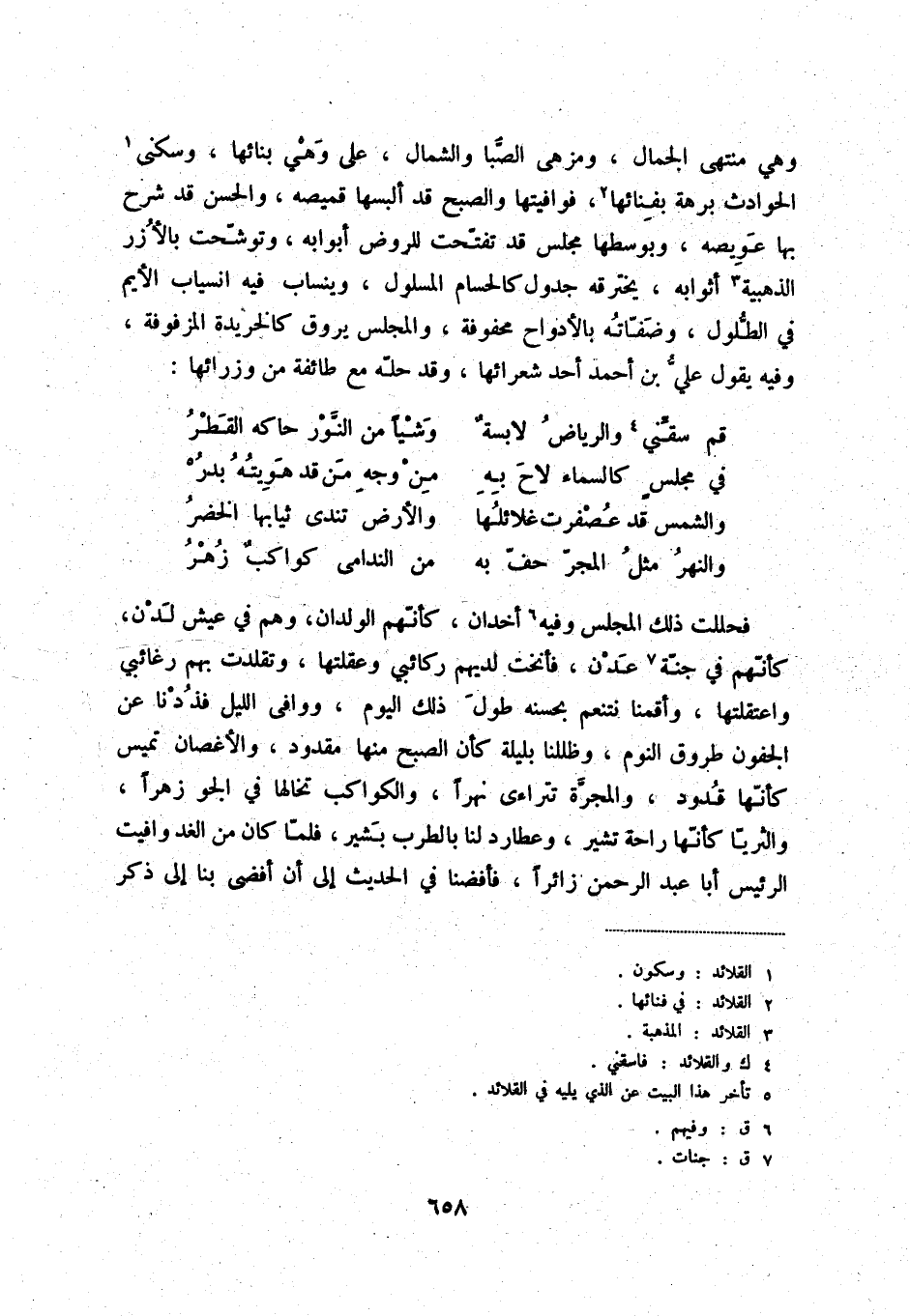 والنهر مثل المجرّ حفّ به ... من الندامى كواكبٌ زهر فحللت ذلك المجلس وفيه (6) أخدان، كأنّهم الولدان، وهم في عيش لدن، كأنّهم في جنّة (7) عدن، فأنخت لديهم ركائبي وعقلتها، وتقلدت بهم رغائبي واعتقلتها، وأقمنا نتنعم بحسنه طول ذلك اليوم، ووافى الليل فذدناعن الجفون طروق النوم، وظللنا بليلة كأن الصبح منها مقدود، والأغصان تميس كأنّها قدود، والمجرّة تتراءى نهراً، والكواكب تخالها في الجو زهراً، والثريّا كأنّها راحة تشير، وعطارد لنا بالطرب بشير، فلمّا كان من الغد وافيت الرئيس أبا عبد الرحمن زائراً، فأفضنا في الحديث إلى أن أفضى بنا إلى ذكر