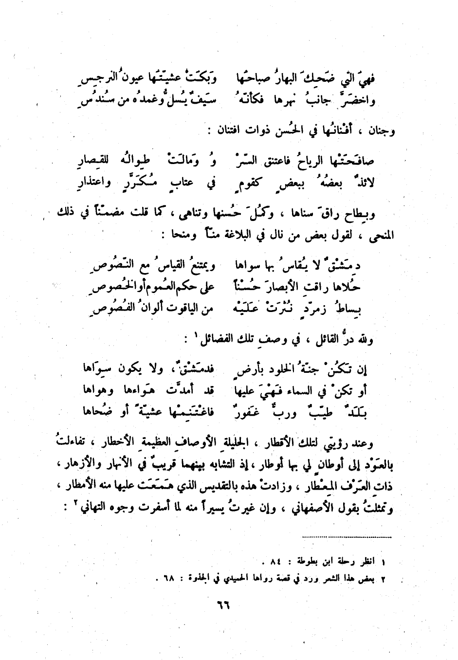 وعند رؤيتي لتلك الأقطار، الجليلة الأوصاف العظيمة الأخطار، فتاءلت بالعود إلى أوطان لي بها أوطار، إذ التشابه بينهما قريب في الأنهار والأزهار، ذات العرف المعطار، وزادت هذه بالتقديس الذي همعت عليها منه الأمطار، وتمثلت بقول الأصفهاني، وإن غيرت يسيراً منه لما أسفرت وجوه التهاني: