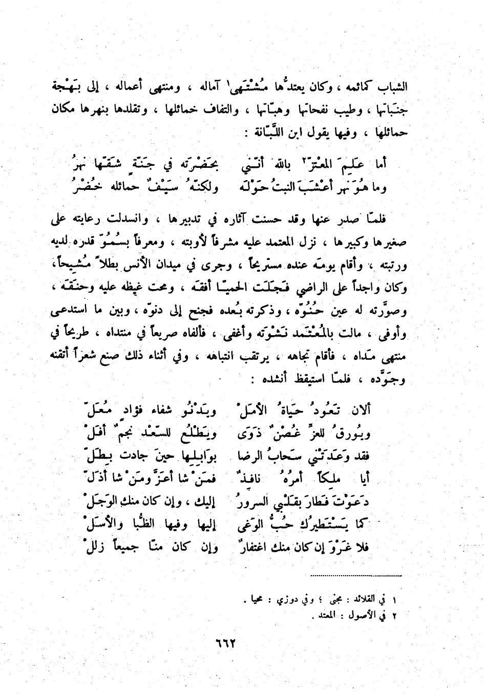 وما هو نهر أعشب النبت حوله ... ولكنّه سيفٌ حمائله خضر فلمّا صدر عنها وقد حسنت آثاره في تدبيرها، وانسدلت رعايته على صغيرها وكبيرها، نزل المعتمد عليه مشرفاً لأوبته، ومعرفاً بسموّ قدره لديه ورتبته، وأقام يومه عنده مستريحاً، وجرى في ميدان الأنس بطلاً مشيحاً، وكان واجداً على الراضي فجلت الحميّا أفقه، ومحت غيظه عليه وحنقه، وصوّرته له عين حنوّه، وذكرته بعده فجنح إلى دنوّه، وبين ما استدعى وأوفى، مالت بالمعتمد نشوته وأغفى، فألفاه صريعاً في منتداه، طريحاً في منتهى مداه، فأقام تجاهه، يرتقب انتباهه، وفي أثناء ذلك صنع شعراً أتقنه وجوّده، فلمّا استيقظ أنشده: