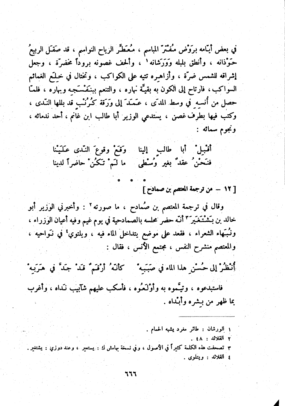 في بعض أيّامه بروض مفترّ المباسم، معطّر الرياح النواسم، قد صقل الربيع حوذانه، وأنطق بلبله وورشانه (1) ، وألحف غصونه بروداً مخضرّة، وجعل إشراقة للشمس ضرّة، وأزاهره تتيه على الكواكب، وتختال في خلع الغمائم السواكب، فارتاح إلى الكون به بقيّة نهاره، والتنعم ببنفسجه وبهاره، فلمّا حصل من أنسه في وسط المدى، عمد إلى ورقة كرنبٍ قد بللها النّدى، وكتب فيها بطرف غصن، يستدعي الوزير أبا طالب ابن غانم، أحد ندمائه، ونجوم سمائه: