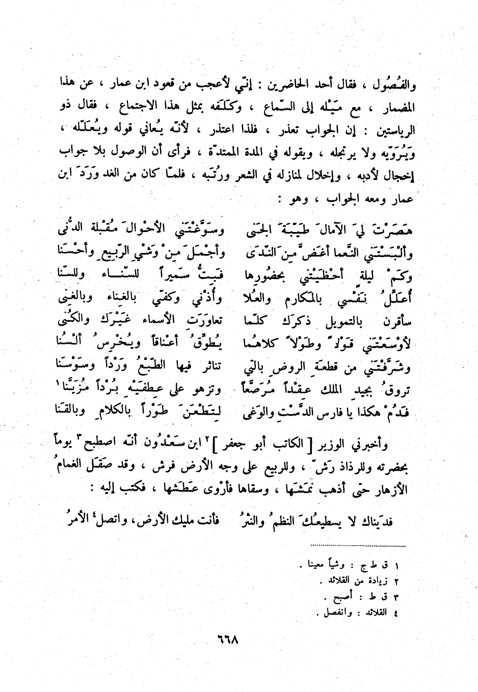 والفصول، فقال أحد الحاضرين: إنّي لأعجب من قعود ابن عمار، عن هذا المضمار، مع ميله إلى السّماع، وكلفه بمثل هذا الاجتماع، فقال ذو الرياستين: إن الجواب تعذر، فلذا اعتذر، لنّه يعاني قوله ويعلّله، ويروّيه ولا يرتجله، ويقوله في المدة الممتدّة، فرأى أن الوصول بلا جواب إخجال لأدبه، وإخلال لمنازله في الشعر ورتبه، فلمّا كان من الغد ورد ابن عمار ومعه الجواب، وهو: