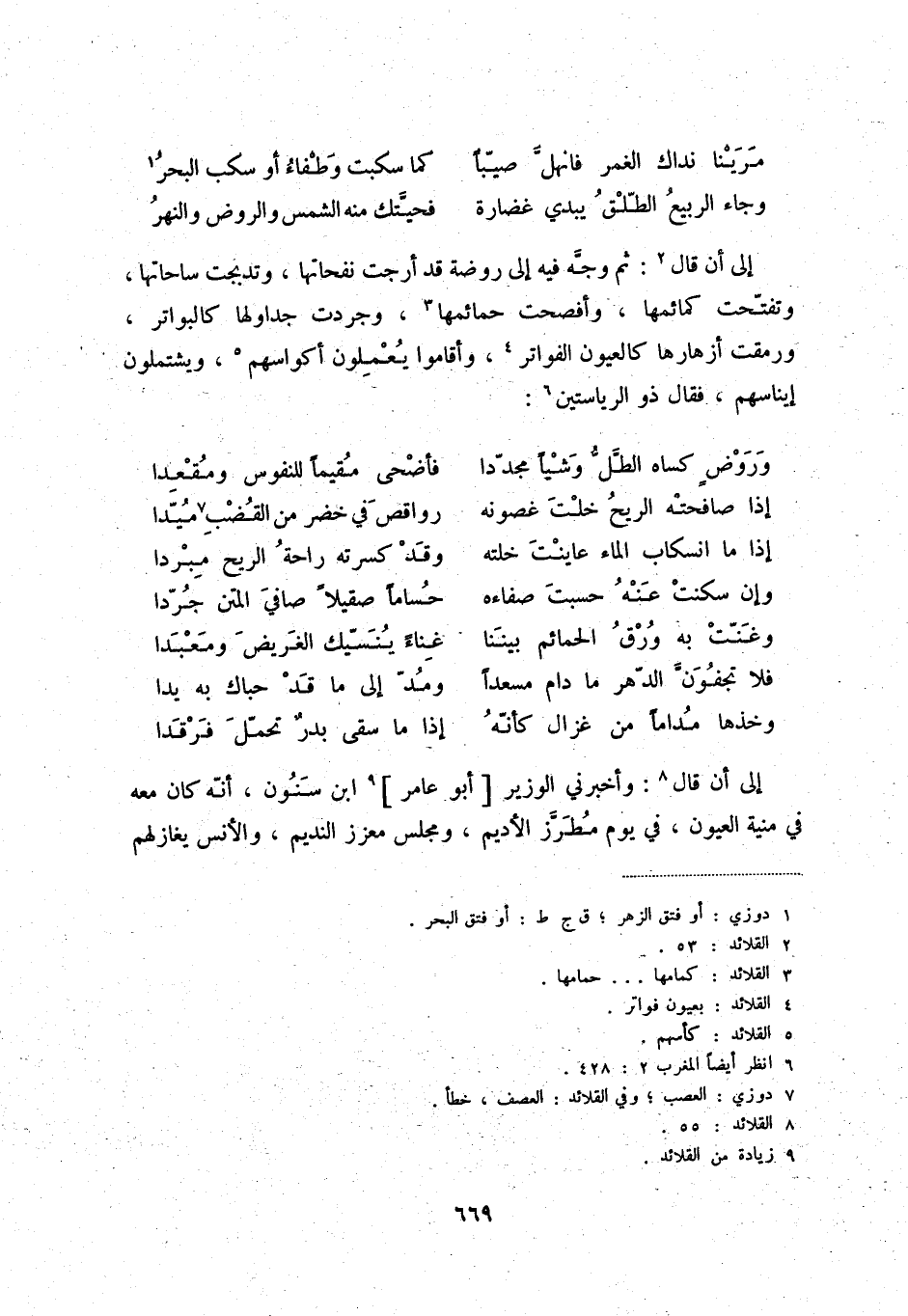 وجاء الربيع الطّلق يبدي غضارة ... فحيّتك منه الشمس والروض والنهر إلى أن قال (2) : ثم وجّه إلى روضة قد أرجت نفحاتها، وتدبجت ساحاتها، وتفتّحت كمائمها، وأفصحت حمائمها (3) ، وجردت جداولها كالبواتر، ورمقت أزهارها كالعيون الفواتر (4) ، وأقاموا يعملون أكواسهم (5) ، ويشتملون إيناسهم، فقال ذو الرياستين (6) :