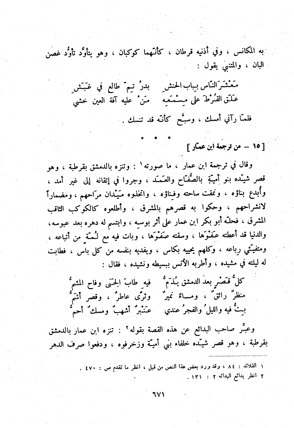 وقال في ترجمة ابن عمار، ما صورته (1) : وتنزه بالدمشق بقرطبة، وهو قصر شيّده بنو أميّة بالصّفّاح والعمد، وجروا في إتقانه إلى غير أمد، وأبدع بناؤه، ونمقت ساحته وفناؤه، واتخذوه ميدان مراحهم، ومضماراً لانشراحهم، وحكوا به قصرهم بالمشرق، وأطلعوه كالكوكب الثاقب المشرق، فحلّه أبو بكر ابن عمّار على أثر بوسه، وابتسم له دهره بعد عبوسه، والدنيا قد أعطت عفوها، وسقته صفوها، وبات فيه مع لمّةٍ من أتباعه، ومتفيئ رباعه، وكلهم يحييه بكاس، ويفديه بنفسه من كل باس، فطابت له ليلته في مشيده، وأطربه الأنس ببسيطه ونشيده، فقال: