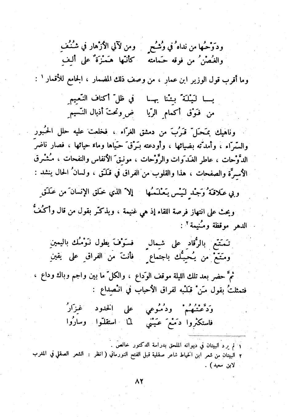وناهيك بمحل قرب من دمشق الغراء، فخلعت عليه حلل الحبور والسراء، وأمدته بضيائها، وأودعته برق حياها وماء حيائها، فصار ناضر الدوحات، عاطر الغدوات والورحات، مونق الأنفاس والنفحات، مشرق السرة والصفحات، هذا والقلوب من الفراق في فلق، ولسان الحال ينشد: