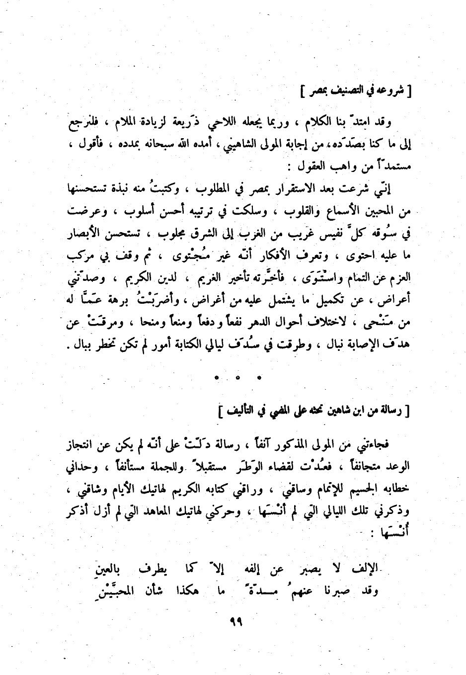 فجاءتني من المولى المذكور آنفاً، رسالة دلت على أنه لم يكن عن انتجاز الوعد متجانفاً، فعدت لقضاء الوطر مستقبلاً وللجملة مستأنفاً، وحداني خطابه الجسيم للإتمام وساقني، وراقني كتابه الكريم لهاتيك الأيام وشاقني، وذكرني تلك الليالي التي لم أنسها، وحركني لهاتيك المعاهد التي لم أزل أذكر أنسها: