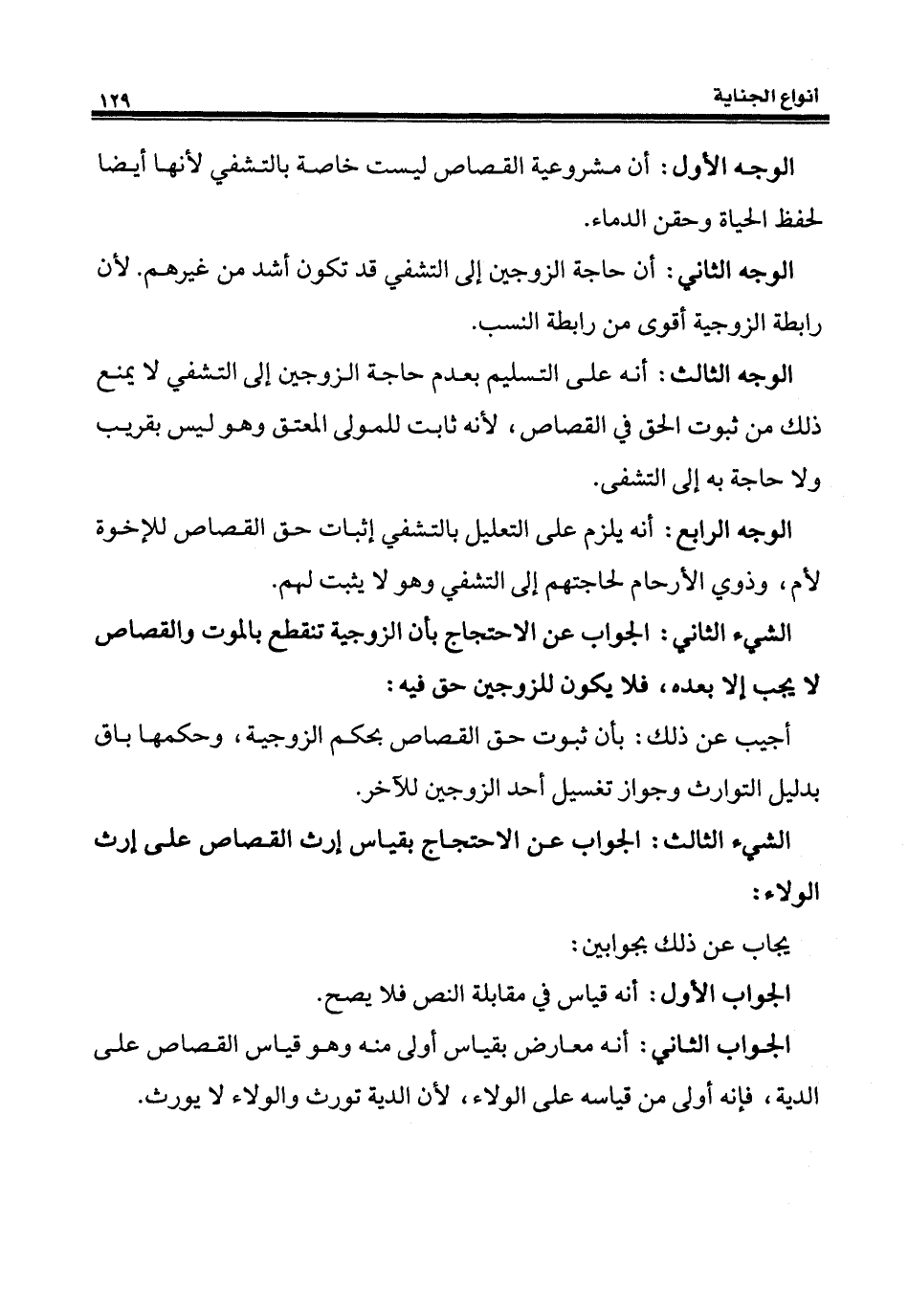 الوجه الثالث: أنه على التسليم بعدم حاجة الزوجين إلى التشفي لا يمنع ذلك من ثبوت الحق في القصاص؛ لأنه ثابت للمولى المعتق وهو ليس بقريب ولا حاجة به إلى التشفى.