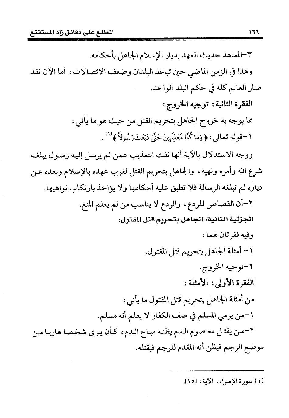 ووجه الاستدلال بالآية أنها نفت التعذيب عمن لم يرسل إليه رسول يبلغه شرع الله وأمره ونهيه، والجاهل بتحريم القتل لقرب عهده بالإسلام وبعده عن دياره لم تبلغه الرسالة فلا تطبق عليه أحكامها ولا يؤاخذ بارتكاب نواهيها.
