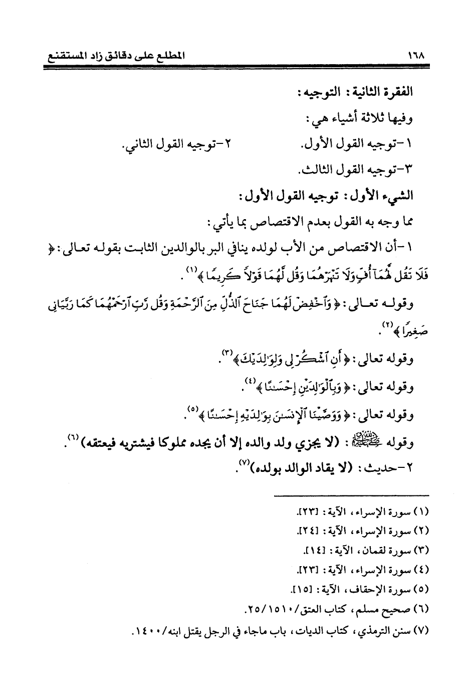 1 - أن الاقتصاص من الأب لولده ينافي البر بالوالدين الثابت بقوله تعالى: {فَلَا تَقُلْ لَهُمَا أُفٍّ وَلَا تَنْهَرْهُمَا وَقُلْ لَهُمَا قَوْلًا كَرِيمًا} (¬1).