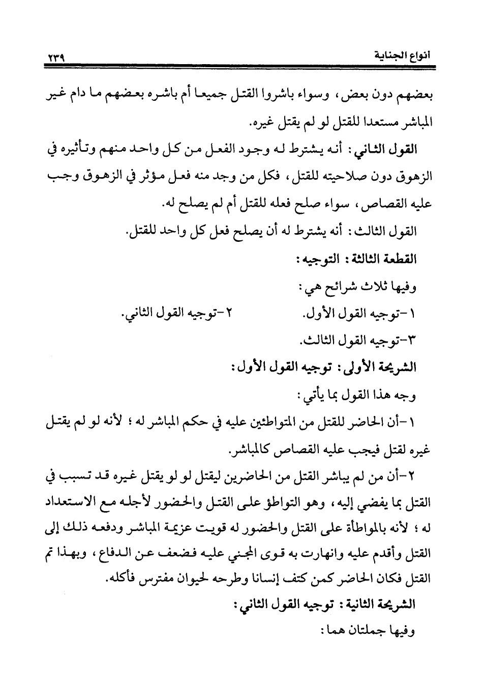 2 - أن من لم يباشر القتل من الحاضرين ليقتل لو لو يقتل غيره قد تسبب في القتل بما يفضي إليه، وهو التواطؤ على القتل والحضور لأجله مع الاستعداد له؛ لأنه بالمواطأة على القتل والحضور له قويت عزيمة المباشر ودفعه ذلك إلى القتل وأقدم عليه وانهارت به قوى المجني عليه فضعف عن الدفاع، وبهذا تم القتل فكان الحاضر كمن كتف إنسانا وطرحه لحيوان مفترس فأكله.
