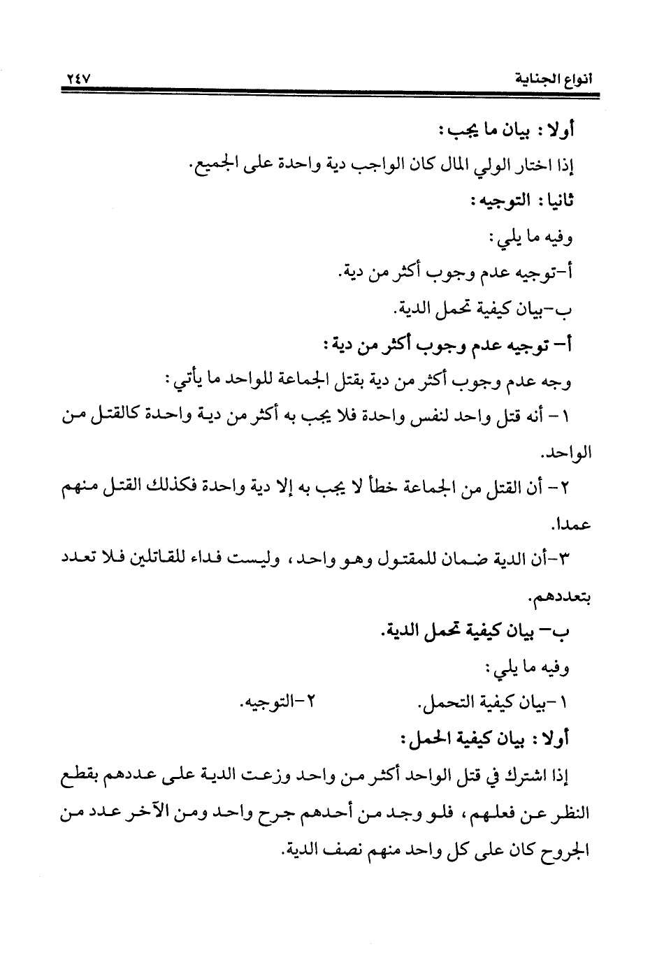 إذا اشترك في قتل الواحد أكثر من واحد وزعت الدية على عددهم بقطع النظر عن فعلهم، فلو وجد من أحدهم جرح واحد ومن الآخر عدد من الجروح كان على كل واحد منهم نصف الدية.