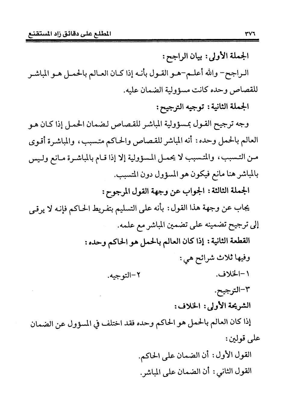 وجه ترجيح القول بمسؤولية المباشر للقصاص لضمان الحمل إذا كان هو العالم بالحمل وحده: أنه المباشر للقصاص والحاكم متسبب، والمباشرة أقوى من التسبب، والمتسبب لا يحمل المسؤولية إلا إذا قام بالمباشرة مانع وليس بالمباشر هنا مانع فيكون هو المسؤول دون المتسبب.