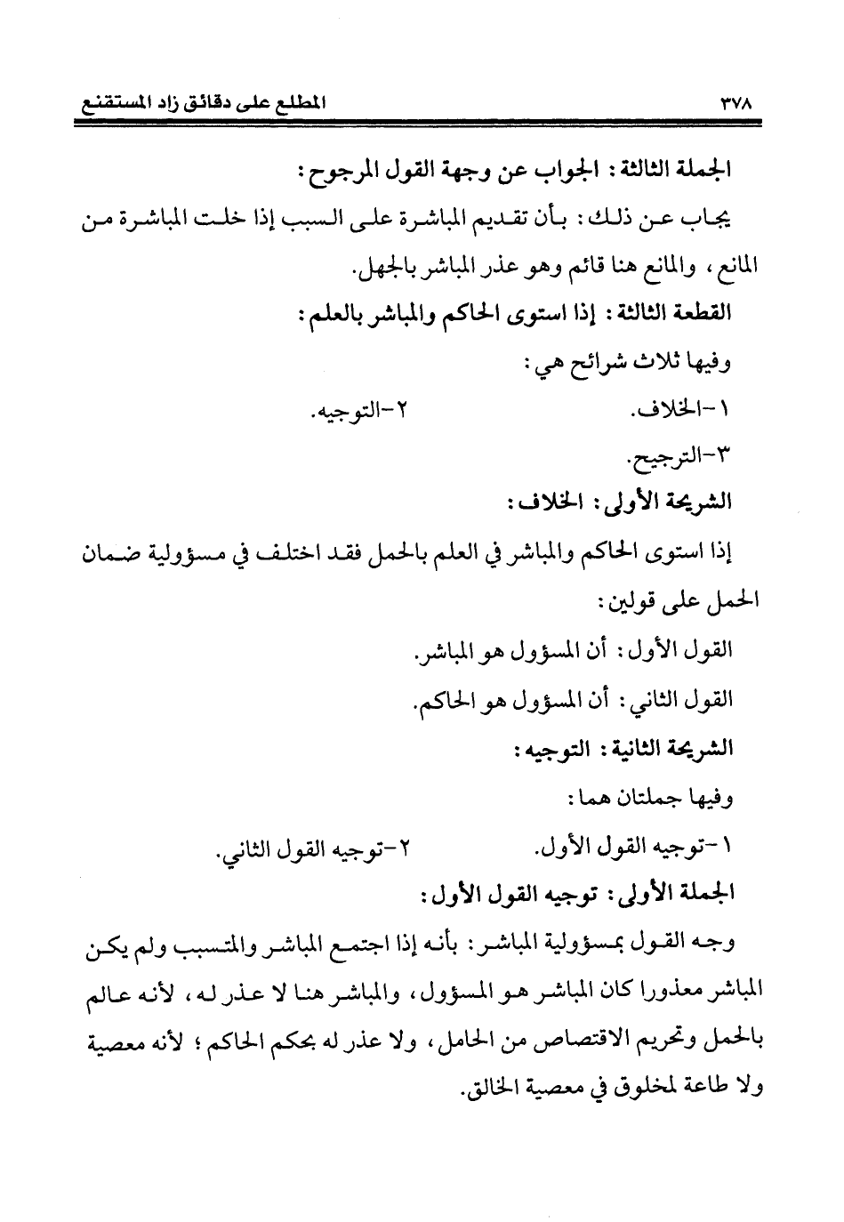 يجاب عن ذلك: بأن تقديم المباشرة على السبب إذا خلت المباشرة من المانع، والمانع هنا قائم وهو عذر المباشر بالجهل.
