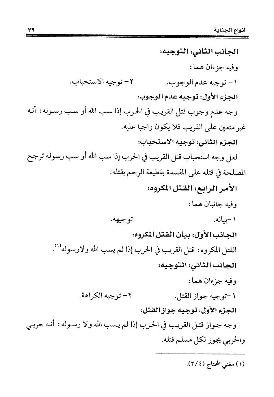 الجزء الأول: توجيه جواز القتل: وجه جواز قتل القريب في الحرب إذا لم يسب الله ولا رسوله: أنه حربي والحربي يجوز لكل مسلم قتله.