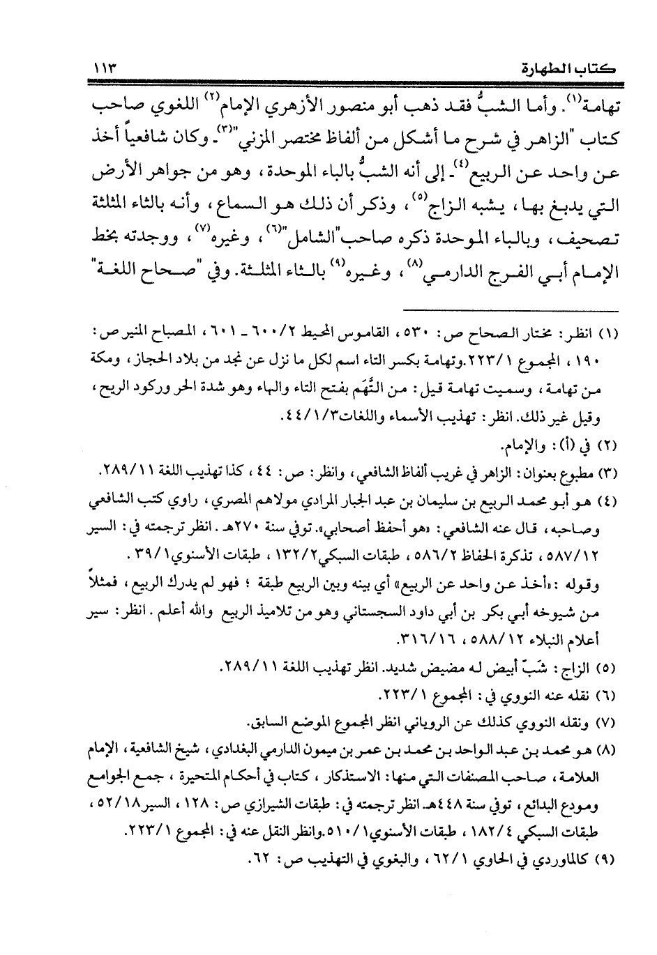 تهامة (¬1). وأما الشبُّ فقد ذهب أبو منصور الأزهري الإمام (¬2) اللغوي صاحب كتاب "الزاهر في شرح ما أشكل من ألفاظ مختصر المزني" (¬3) - وكان شافعياً أخذ عن واحد عن الربيع (¬4) - إلى أنه الشبُّ بالباء الموحدة، وهو من جواهر الأرض التي يدبغ بها، يشبه الزاج (¬5)، وذكر أن ذلك هو السماع، وأنه بالثاء المثلثة تصحيف، وبالباء الموحدة ذكره صاحب "الشامل" (¬6)، وغيره (¬7)، ووجدته بخط الإِمام أبي الفرج الدارمي (¬8)، وغيره (¬9) بالثاء المثلثة. وفي "صحاح اللغة"