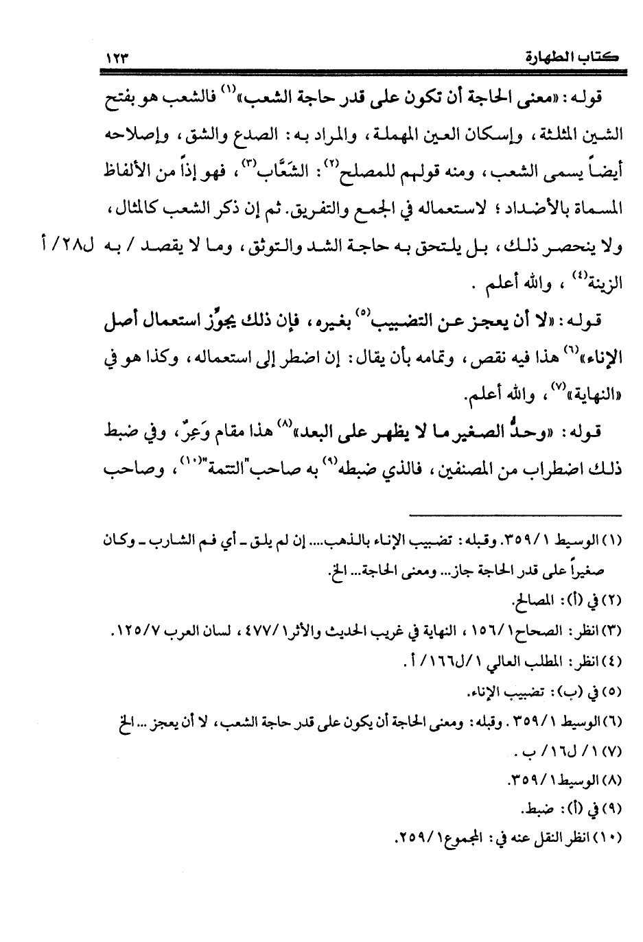 قوله: "معنى الحاجة أن تكون على قدر حاجة الشعب" (¬1) فالشعب هو بفتح الشين المثلثة، وإسكان العين المهملة، والمراد به: الصدع والشق، وإصلاحه أيضاً يسمى الشعب، ومنه قولهم للمصلح (¬2): الشَعَّاب (¬3)، فهو إذاً من الألفاظ المسماة بالأضداد؛ لاستعماله في الجمع والتفريق. ثم إن ذكر الشعب كالمثال، ولا ينحصر ذلك، بل يلتحق به حاجة الشد والتوثق، وما لا يقصد به الزينة (¬4)، والله أعلم.