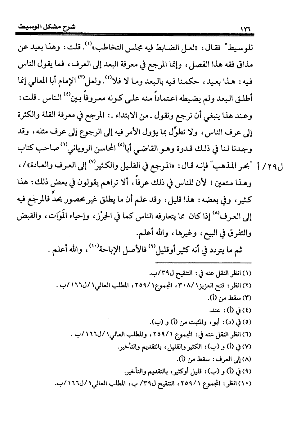 للوسيط" فقال: "لعل الضابط فيه مجلس التخاطب" (¬1). قلت: وهذا بعيد عن مذاق فقه هذا الفصل، وإنما المرجع في معرفة البعد إلى العرف، فما يقول الناس فيه: هذا بعيد، حكمنا فيه بالبعد وما لا فلا (¬2). ولعل (¬3) الإمام أبا المعالي إنما أطلق البعد ولم يضبطه اعتماداً منه على كونه معروفاً بين (¬4) الناس. قلت: وعند هذا ينبغي أن نرجع ونقول - من الابتداء -: المرجع في معرفة القلة والكثرة إلى عرف الناس، ولا نطوِّل بما يؤول الأمر فيه إلى الرجوع إلى عرف مثله، وقد وجدنا لنا في ذلك قدوة وهو القاضي أبا (¬5) المحاسن الروياني (¬6) صاحب كتاب "بحر المذهب" فإنه قال: "المرجع في القليل والكثير (¬7) إلى العرف والعادة"، وهذا متعين؛ لأن للناس في ذلك عرفاً، ألا تراهم يقولون في بعض ذلك: هذا كثير، وفي بعضه: هذا قليل، وقد علم أن ما يطلق غير محصور بحدًّ فالمرجع فيه إلى العرف (¬8) إذا كان مما يتعارفه الناس كما في الحِرْز، وإحياء المَوَات، والقبض والتفرق في البيع، وغيرها، والله أعلم.