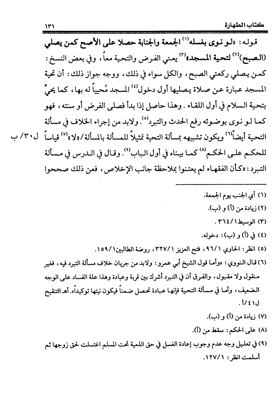 (¬6) قال النووي: "وأما قول الشيخ أبي عمرو: ولا بد من جريان خلاف مسألة التبرد فيه، فغير منقول ولا مقبول، والفرق أن في التبرد أشرك بين قربة وعبادة وهذا علة الفساد على الوجه الضعيف، وأما في مسألة التحية فإنها عبادة تحصل ضمناً فيكون نيتها توكيداً". أهـ التنقيح ل 41/ أ.