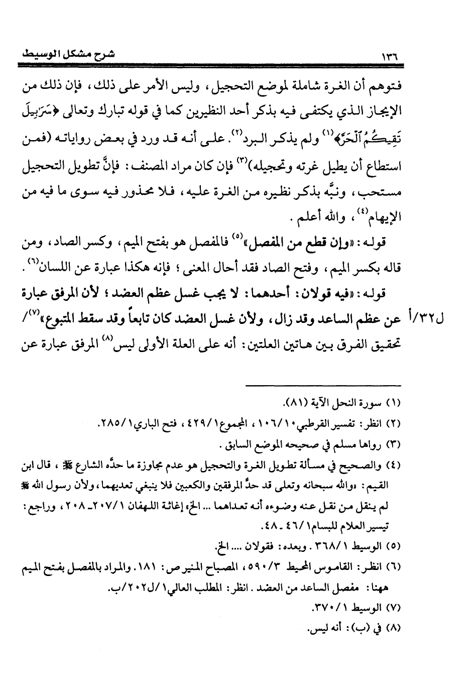 (¬6) انظر: القاموس المحيط 3/ 590، المصباح المنير ص: 181. والمراد بالمفصل بفتح الميم ههنا: مفصل الساعد من العضد. انظر: المطلب العالي 1/ ل 202/ ب.