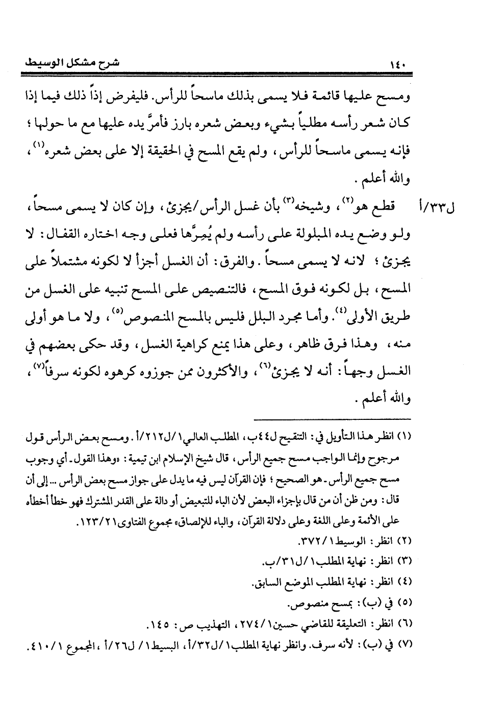 (¬1) انظر هذا التأويل في: التنقيح ل 44 ب، المطلب العالي 1/ ل 212/ أ. ومسح بعض الرأس قول مرجوح وإنما الواجب مسح جميع الرأس، قال شيخ الإسلام ابن تيمية: "وهذا القول - أي وجوب مسح جميع الرأس - هو الصحيح؛ فإن القرآن ليس فيه ما يدل على جواز مسح بعض الرأس ... إلى أن قال: ومن ظن أن من قال بإجزاء البعض لأن الباء للتبعيض أو دالة على القدر المشترك فهو خطأ أخطأه على الأئمة وعلى اللغة وعلى دلالة القرآن، والباء للإلصاق" مجموع الفتاوى 21/ 123.