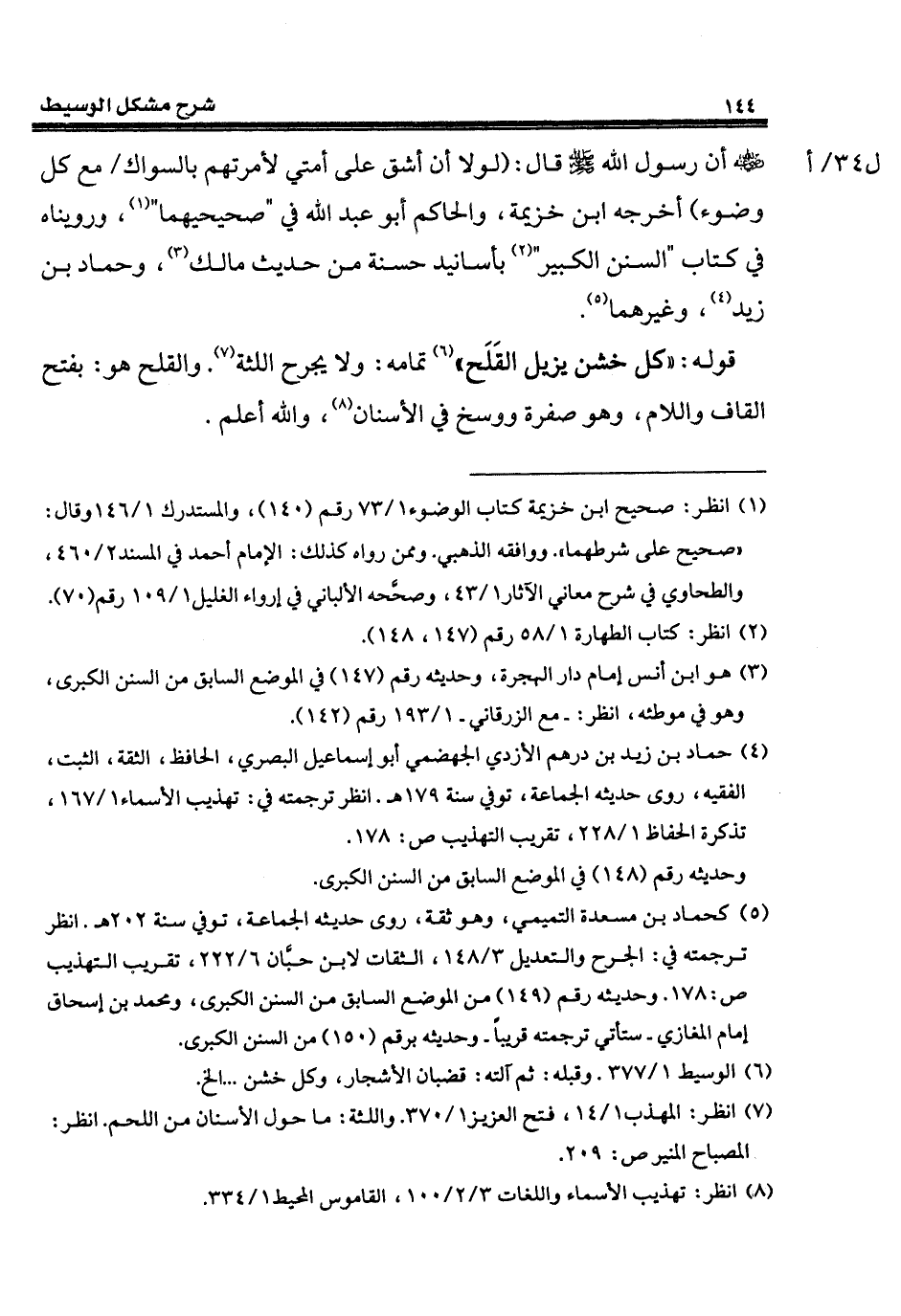 قوله: "كل خشن يزيل القَلَح" (¬6) تمامه: ولا يجرح اللثة (¬7). والقلح هو: بفتح القاف واللام، وهو صفرة ووسخ في الأسنان (¬8)، والله أعلم.