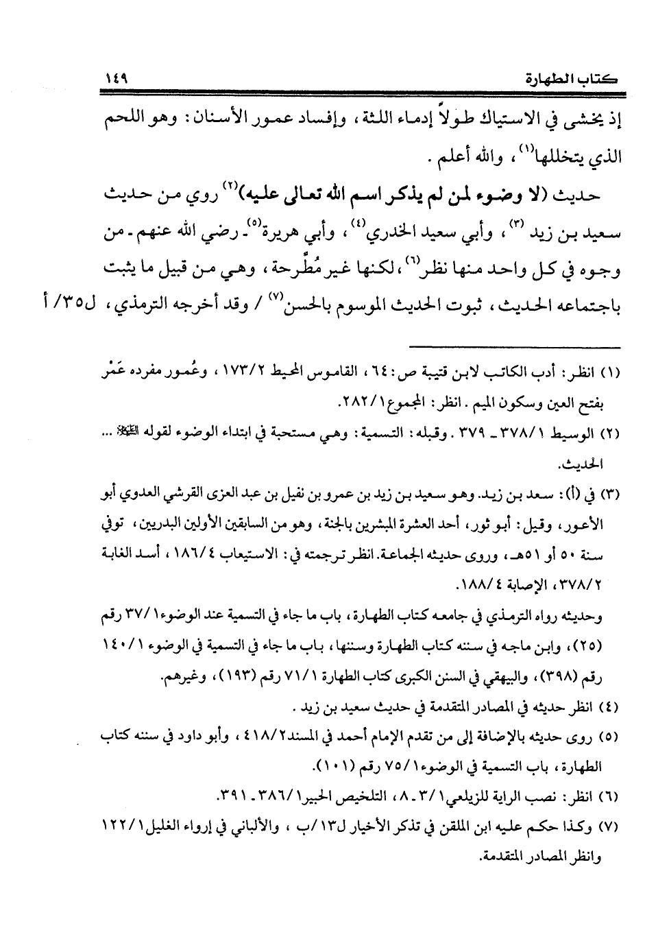 (¬5) روى حديثه بالإضافة إلى من تقدم الإمام أحمد في المسند 2/ 418، وأبو داود في سننه كتاب الطهارة، باب التسمية في الوضوء 1/ 75 رقم (101).