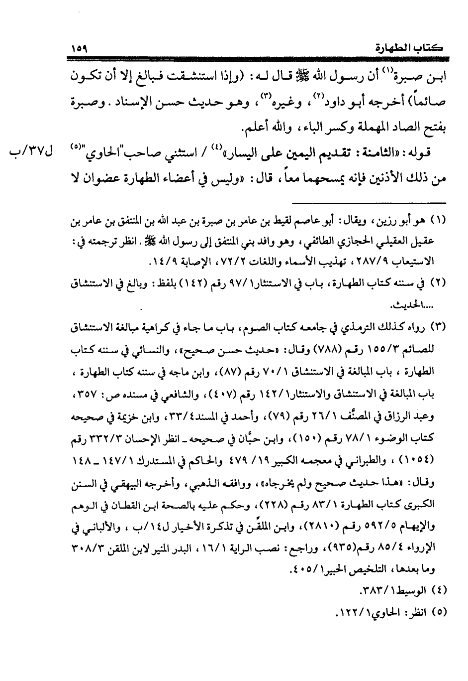 (¬3) رواه كذلك الترمذي في جامعه كتاب الصوم، باب ما جاء في كراهية مبالغة الاستنشاق للصائم 3/ 155 رقم (788) وقال: "حديث حسن صحيح"، والنسائي في سننه كتاب الطهارة، باب المبالغة في الاستنشاق 1/ 70 رقم (87)، وابن ماجه في سننه كتاب الطهارة، باب المبالغة في الاستنشاق والاستنثار 1/ 142 رقم (407)، والشافعي في مسنده ص: 357، وعبد الرزاق في المصنَّف 1/ 26 رقم (79)، وأحمد في المسند 4/ 33، وابن خزيمة في صحيحه كتاب الوضوء 1/ 78 رقم (150)، وابن حبّان في صحيحه - انظر الإحسان 3/ 332 رقم (1054)، والطبراني في معجمه الكبير 19/ 479 والحاكم في المستدرك 1/ 147 - 148 وقال: "هذا حديث صحيح ولم يخرجاه"، ووافقه الذهبي، وأخرجه البيهقي في السنن الكبرى كتاب الطهارة 1/ 83 رقم (228)، وحكم عليه بالصحة ابن القطان في الوهم والإيهام 5/ 592 رقم (2810)، وابن الملقَّن في تذكرة الأخيار ل 14/ ب، والألباني في الإرواء 4/ 85 رقم (935)، وراجع: نصب الراية 1/ 16، البدر المنير لابن الملقن 3/ 308 وما بعدها، التلخيص الحبير 1/ 405.
