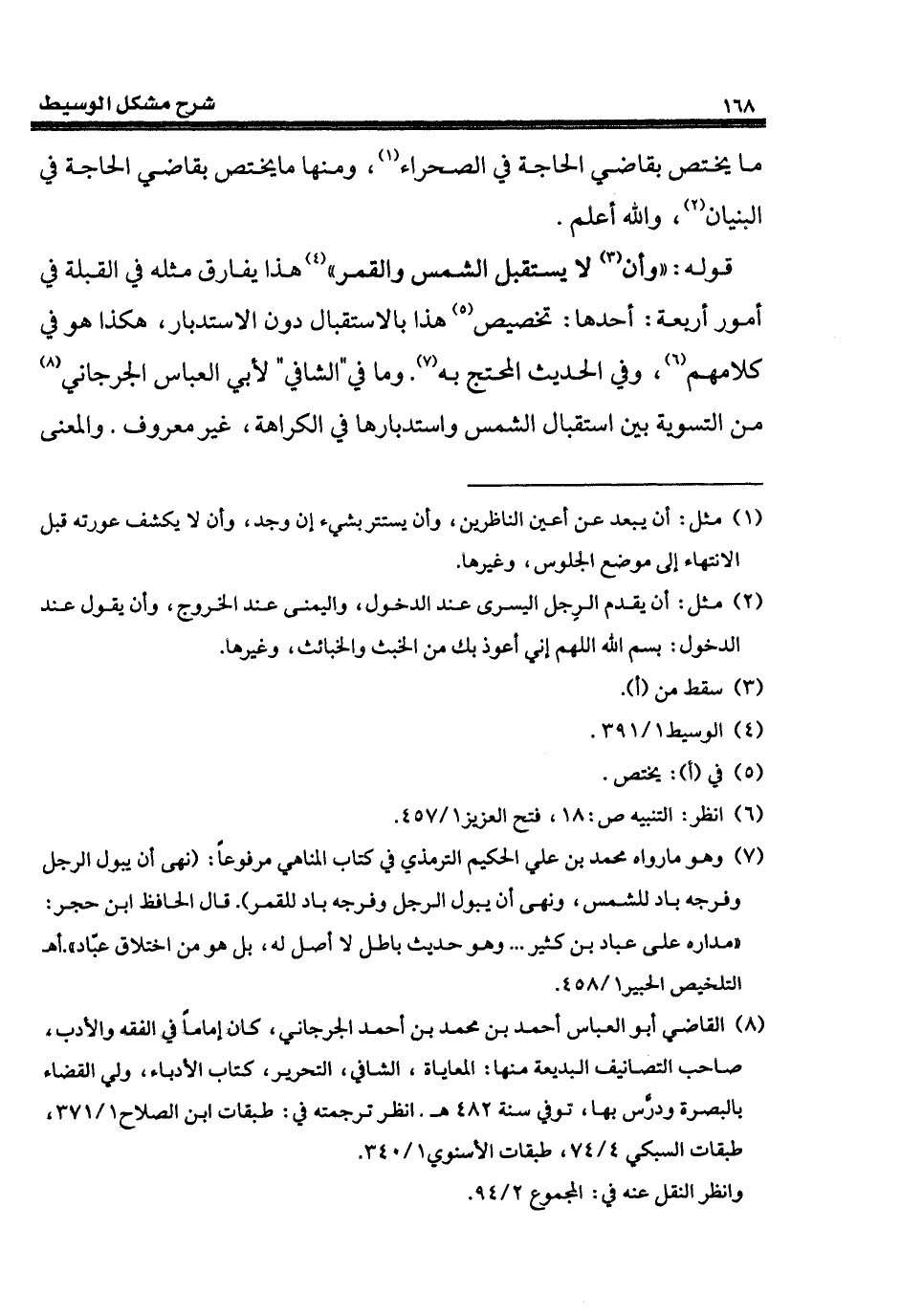 قوله: "وأن (¬3) لا يستقبل الشمس والقمر" (¬4) هذا يفارق مثله في القبلة في أمور أربعة: أحدها: تخصيص (¬5) هذا بالاستقبال دون الاستدبار، هكذا هو في كلامهم (¬6)، وفي الحديث المحتج به (¬7). وما في "الشافي" لأبي العباس الجرجاني (¬8) من التسوية بين استقبال الشمس واستدبارها في الكراهة، غير معروف. والمعنى