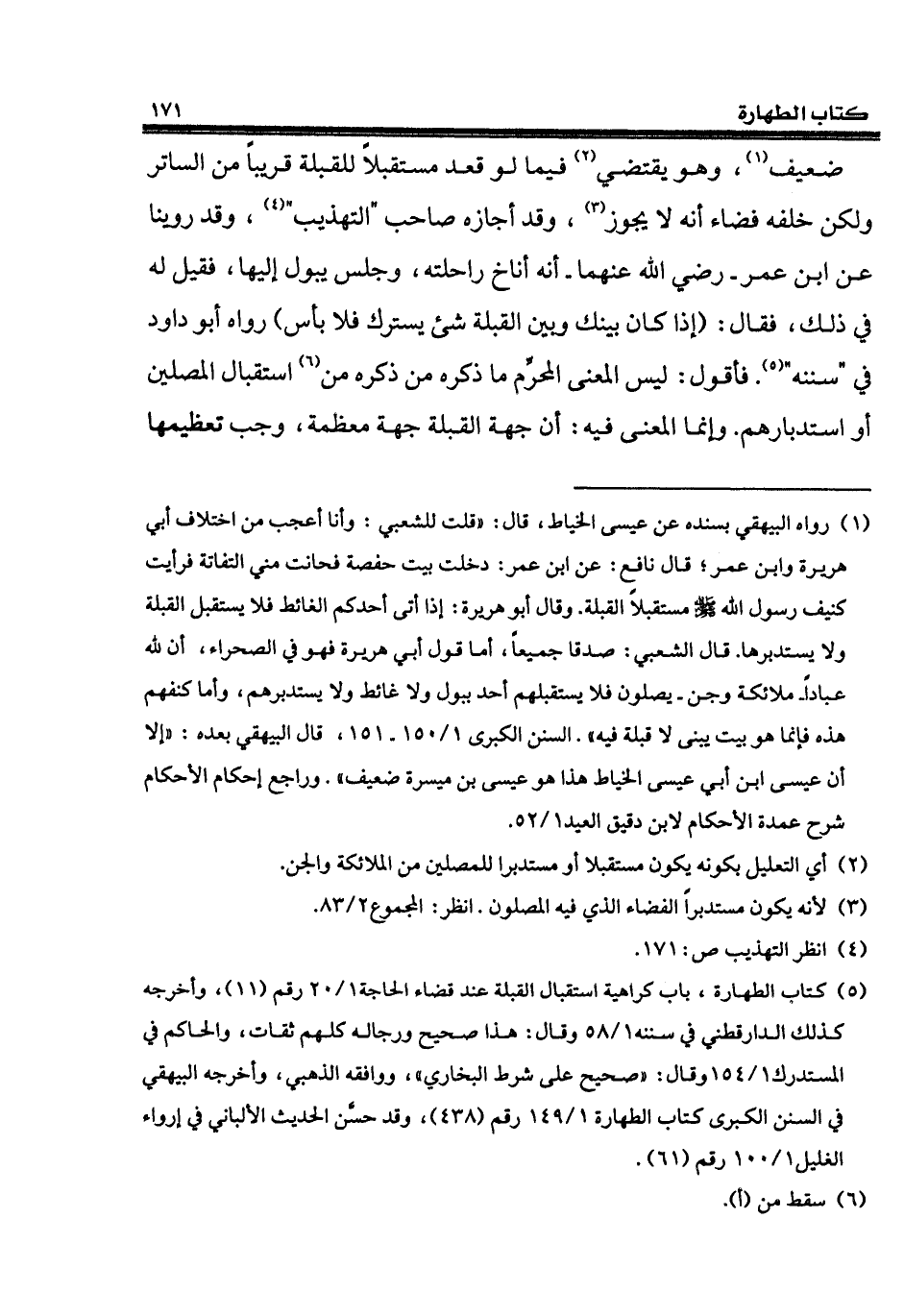 (¬1) رواه البيهقي بسنده عن عيسى الخياط، قال: "قلت للشعبي: وأنا أعجب من اختلاف أبي هريرة وابن عمر؛ قال نافع: عن ابن عمر: دخلت بيت حفصة فحانت مني التفاتة فرأيت كنيف رسول الله - صلى الله عليه وسلم - مستقبلاً القبلة. وقال أبو هريرة: إذا أتى أحدكم الغائط فلا يستقبل القبلة ولا يستدبرها. قال الشعبي: صدقا جميعاً، أما قول أبي هريرة فهو في الصحراء، أن لله عباداً - ملائكة وجن - يصلون فلا يستقبلهم أحد ببول ولا غائط ولا يستدبرهم، وأما كنفهم هذه فإنما هو بيت يبنى لا قبلة فيه". السنن الكبرى 1/ 150 - 151، قال البيهقي بعده: "إلا أن عيسى ابن أبي عيسى الخياط هذا هو عيسى بن ميسرة ضعيف". وراجع إحكام الأحكام شرح عمدة الأحكام لابن دقيق العيد 1/ 52.
